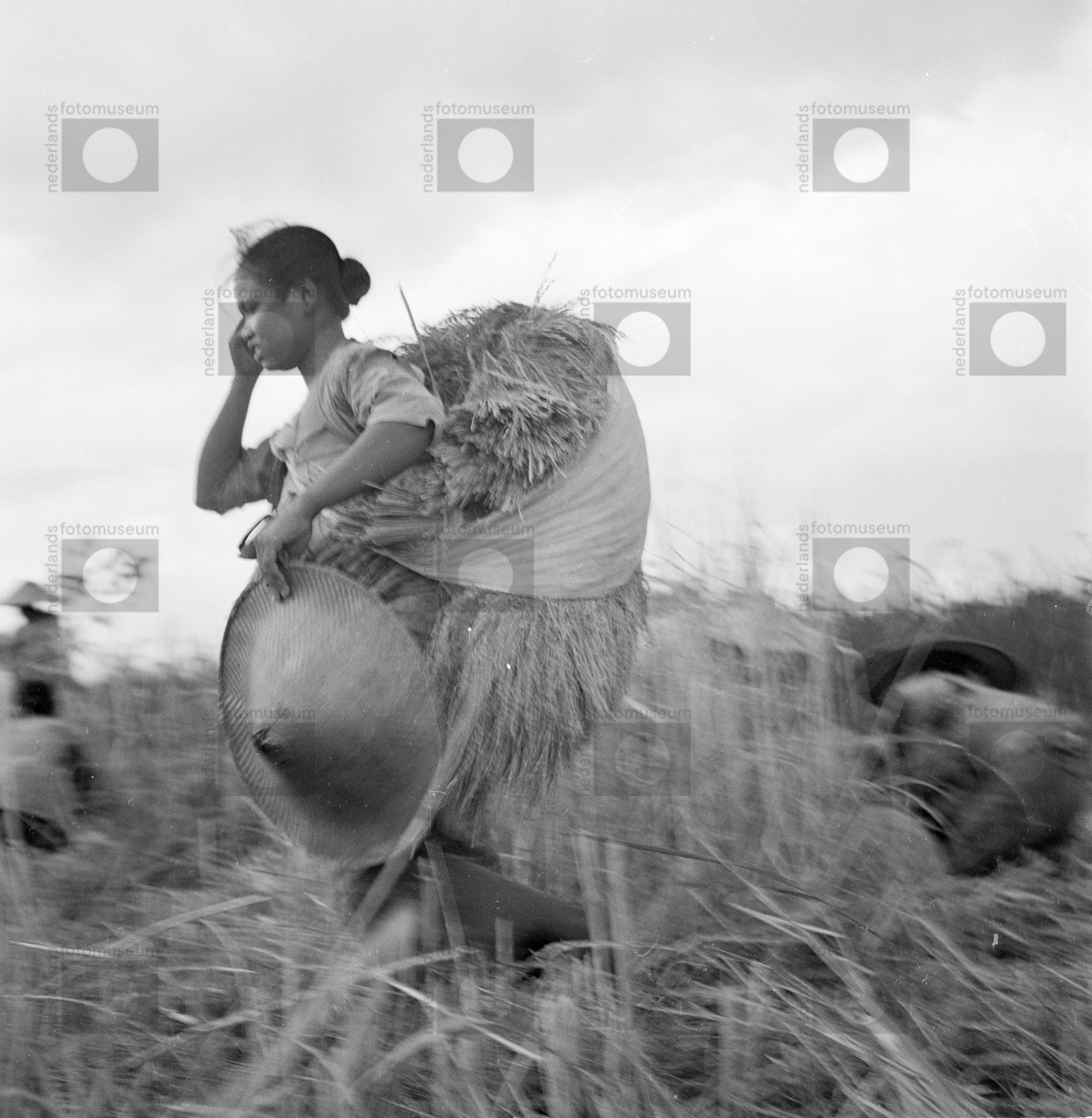 Een landarbeider draagt de rijstoogst van de sawa op...
