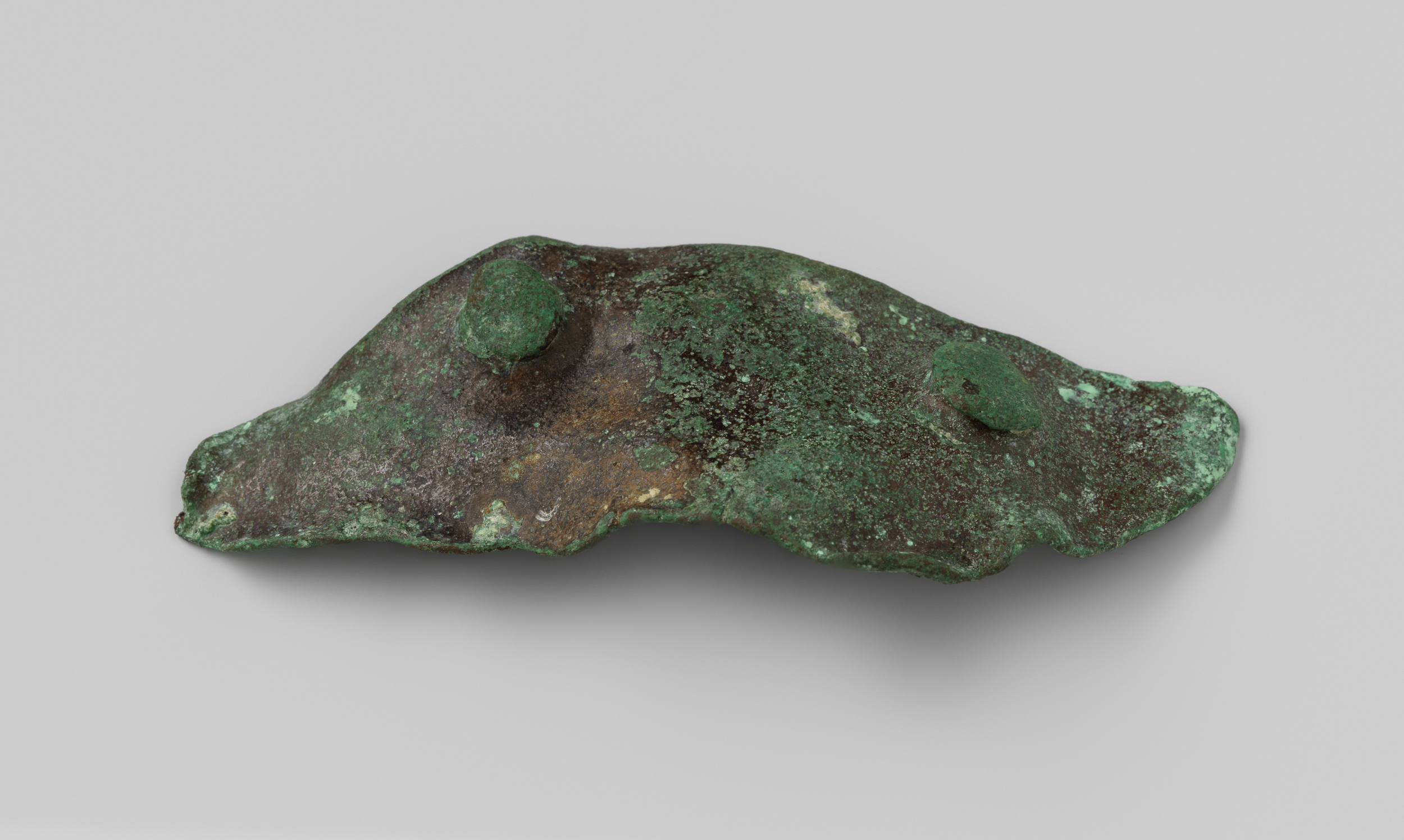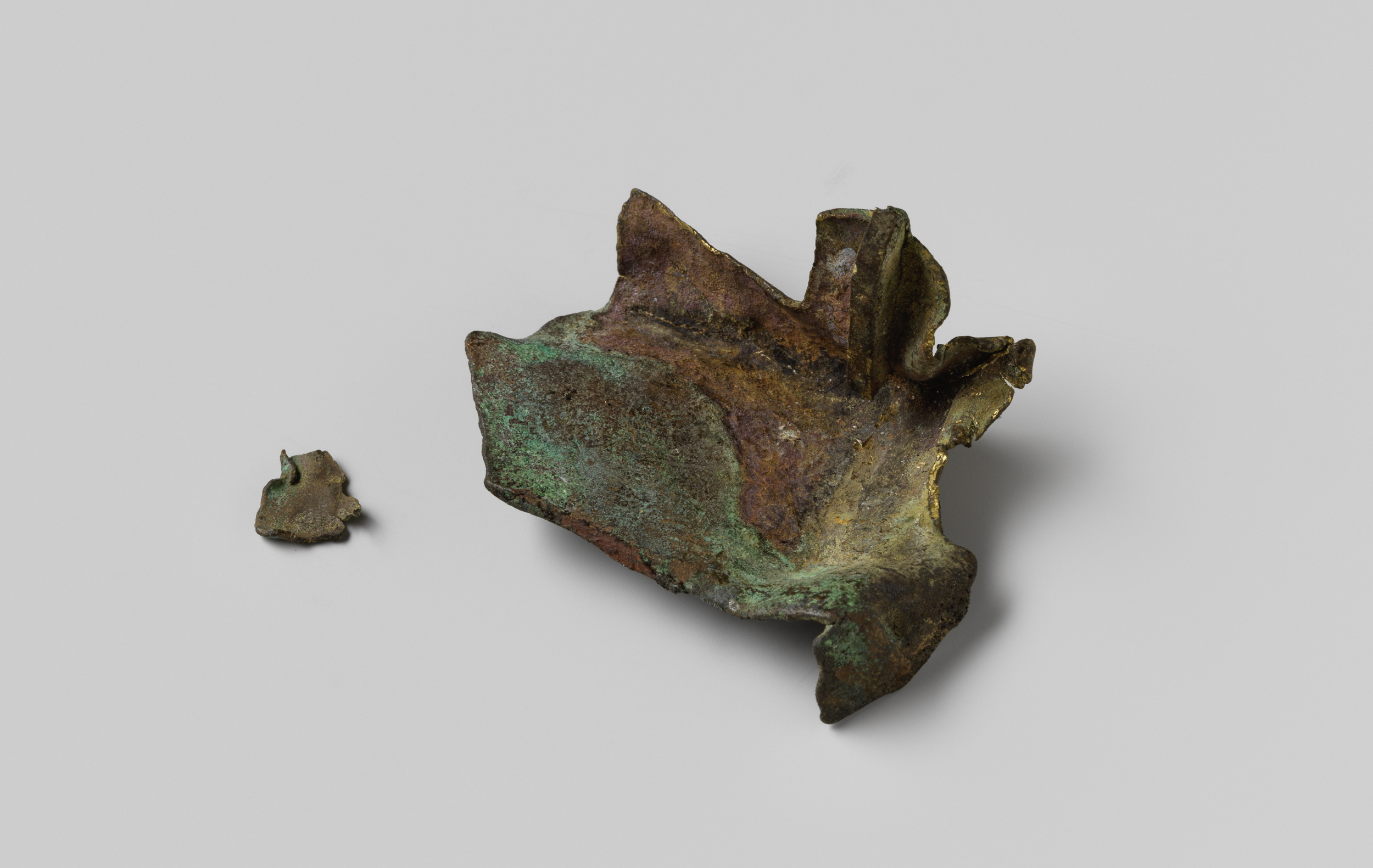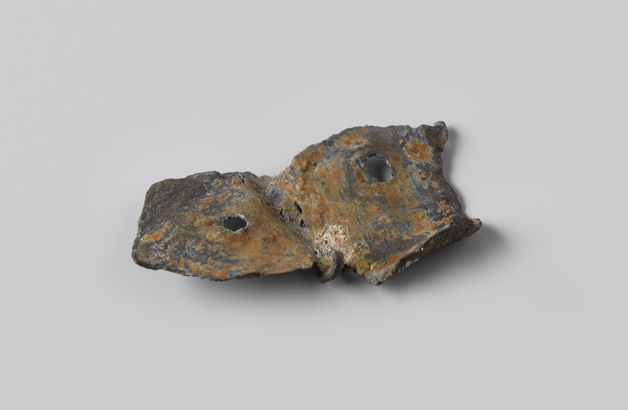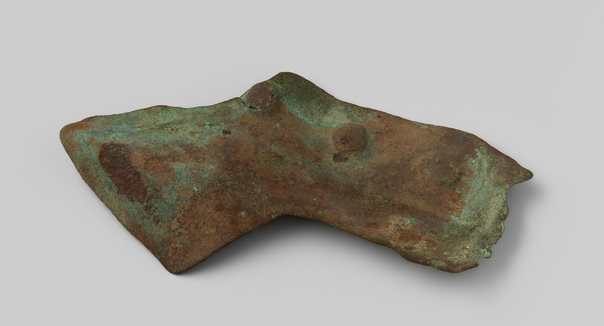 Fragment koperen plaatwerk met klinknagels uit het w...