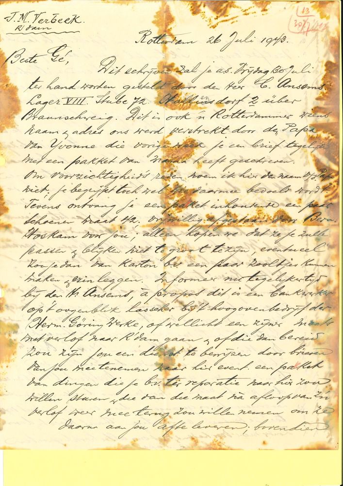 Brief van vader in Rottedam aan Gé Verbeek in Watens...
