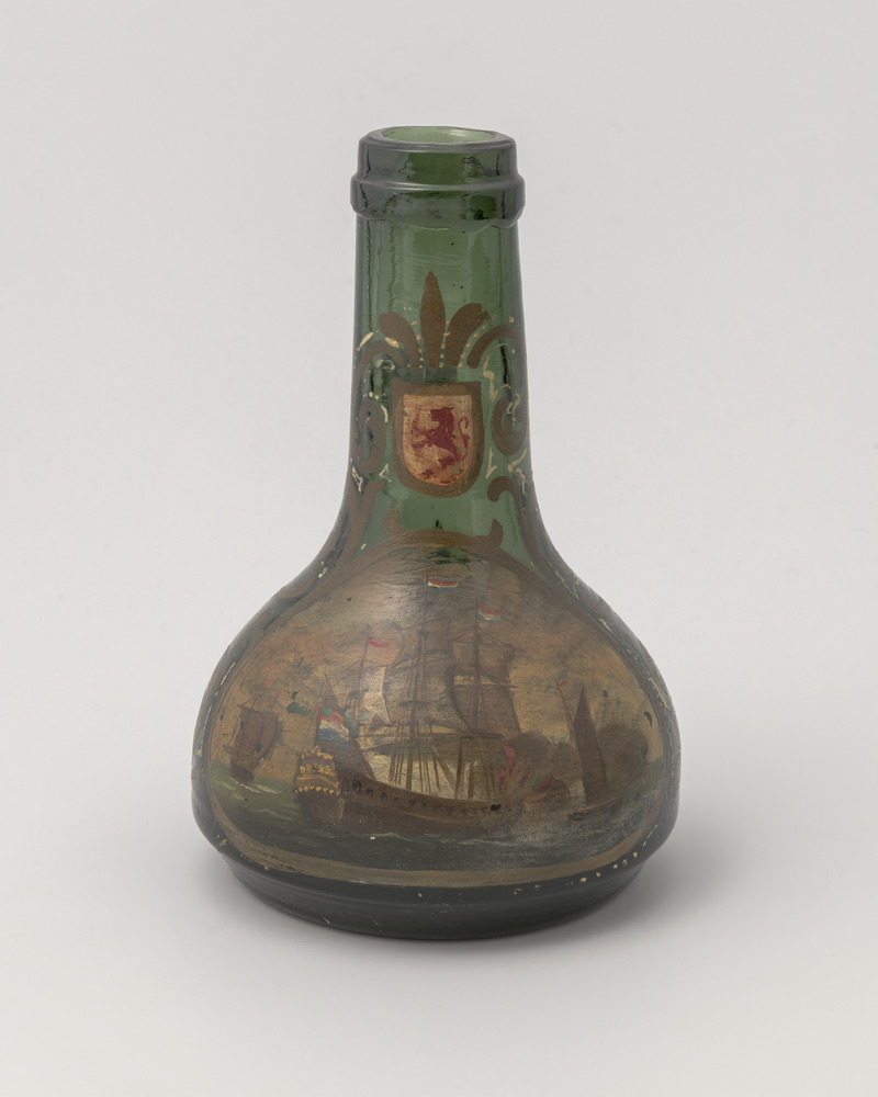 Een bolbuikig donkergroene fles met hoge ziel; tuit ...