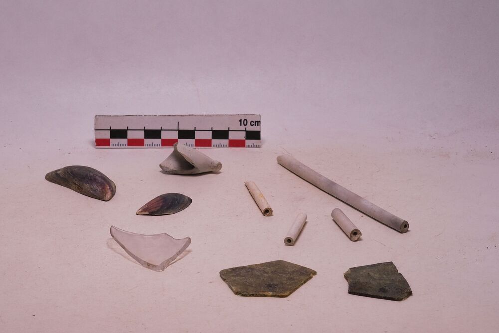 Fragmenten, been/aardewerk/ijzer/glas/schelp/kalk,