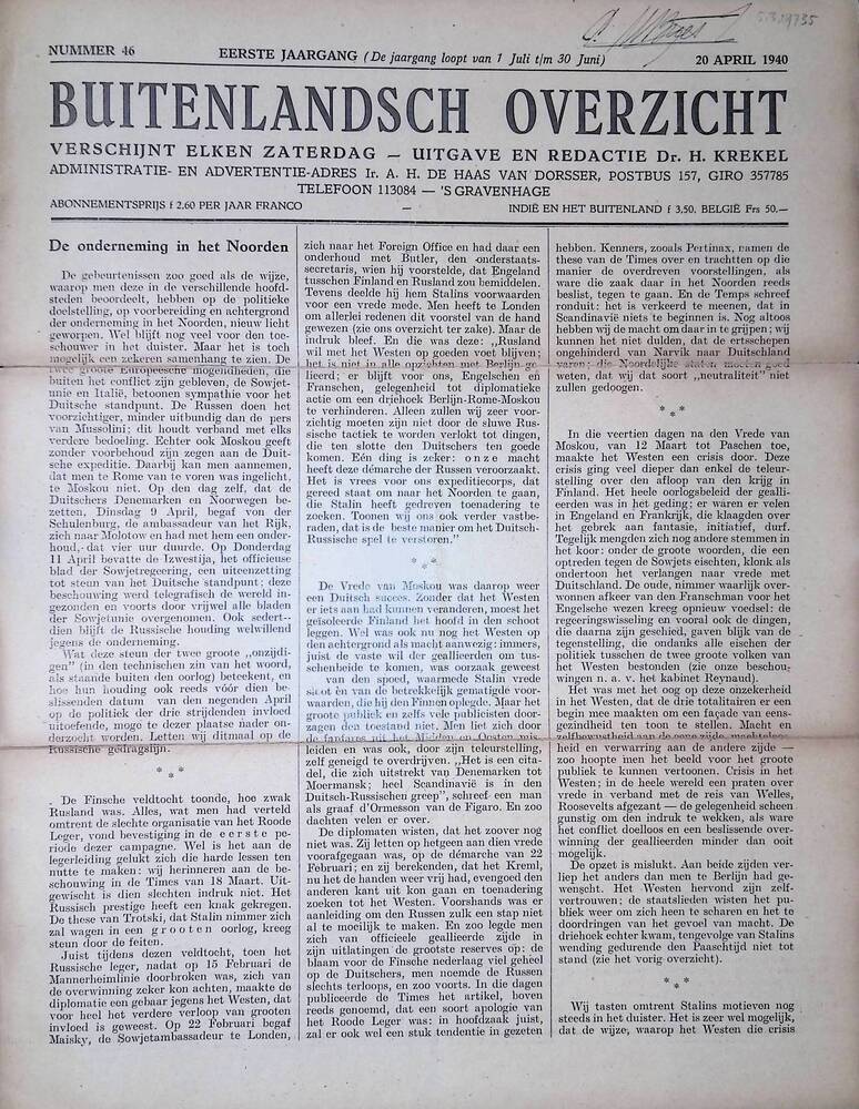 Buitenlandsch overzicht, 20 april 1940