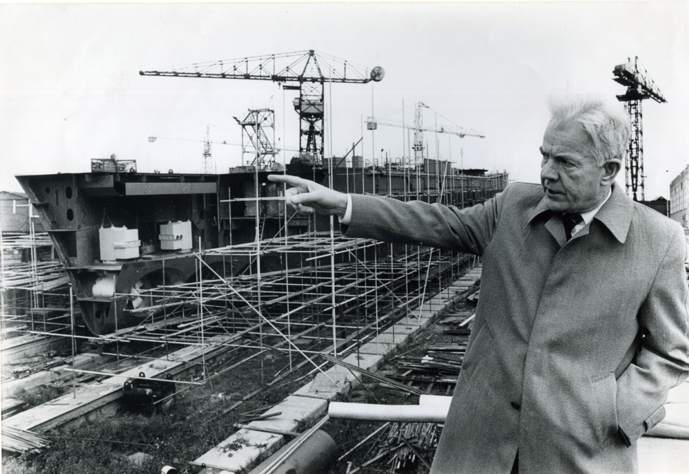 Zwart-wit foto van de heer P. Nienhuis op scheepswer...