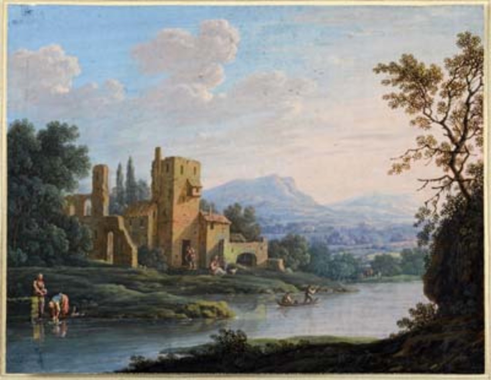 Rivierlandschap met ruïne en bergen