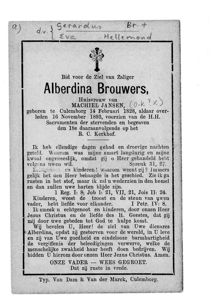 bidprent voor Alberdina Brouwers. Geboren 14-02-1828...