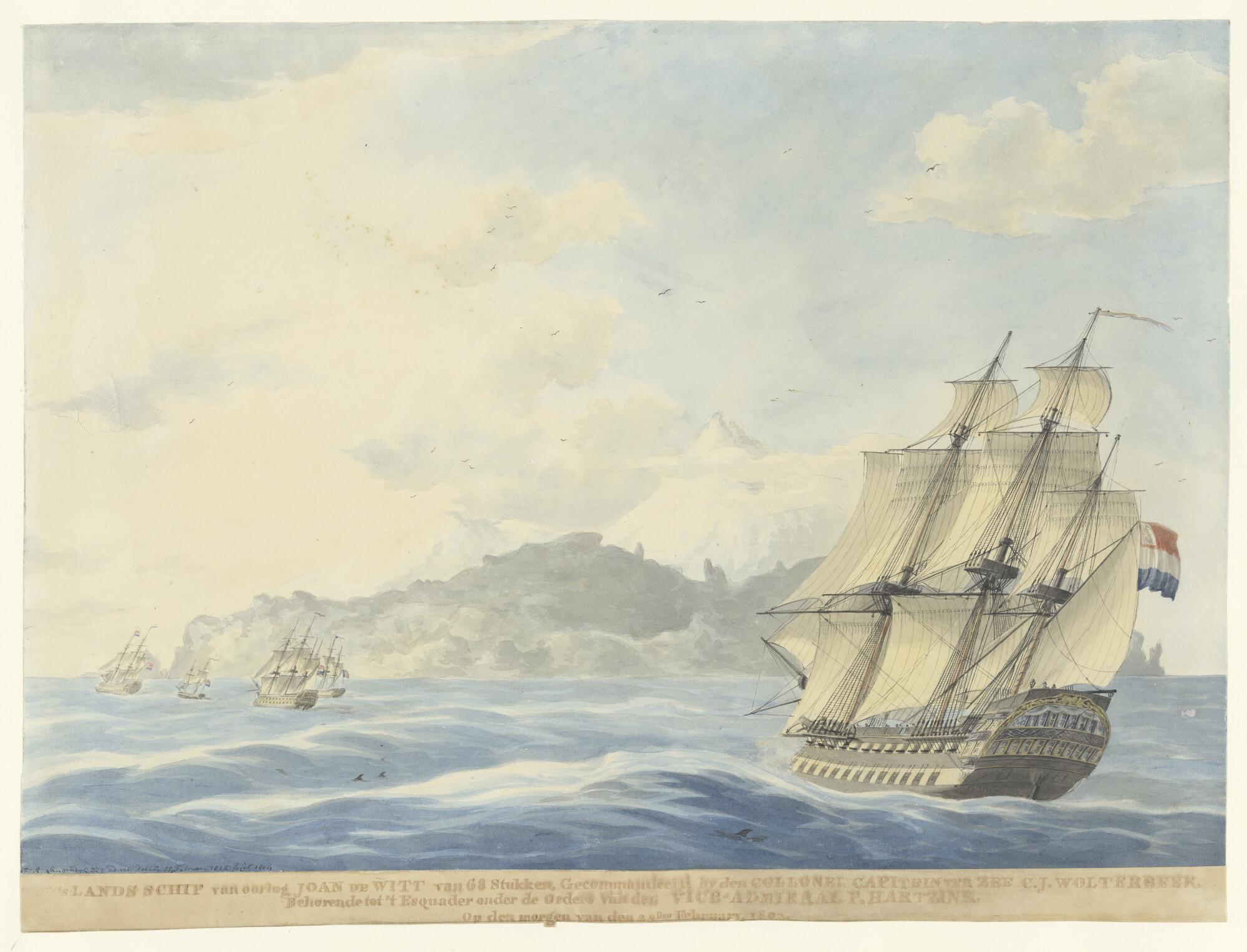 Nederlandse oorlogsschepen op de rede van het eiland...