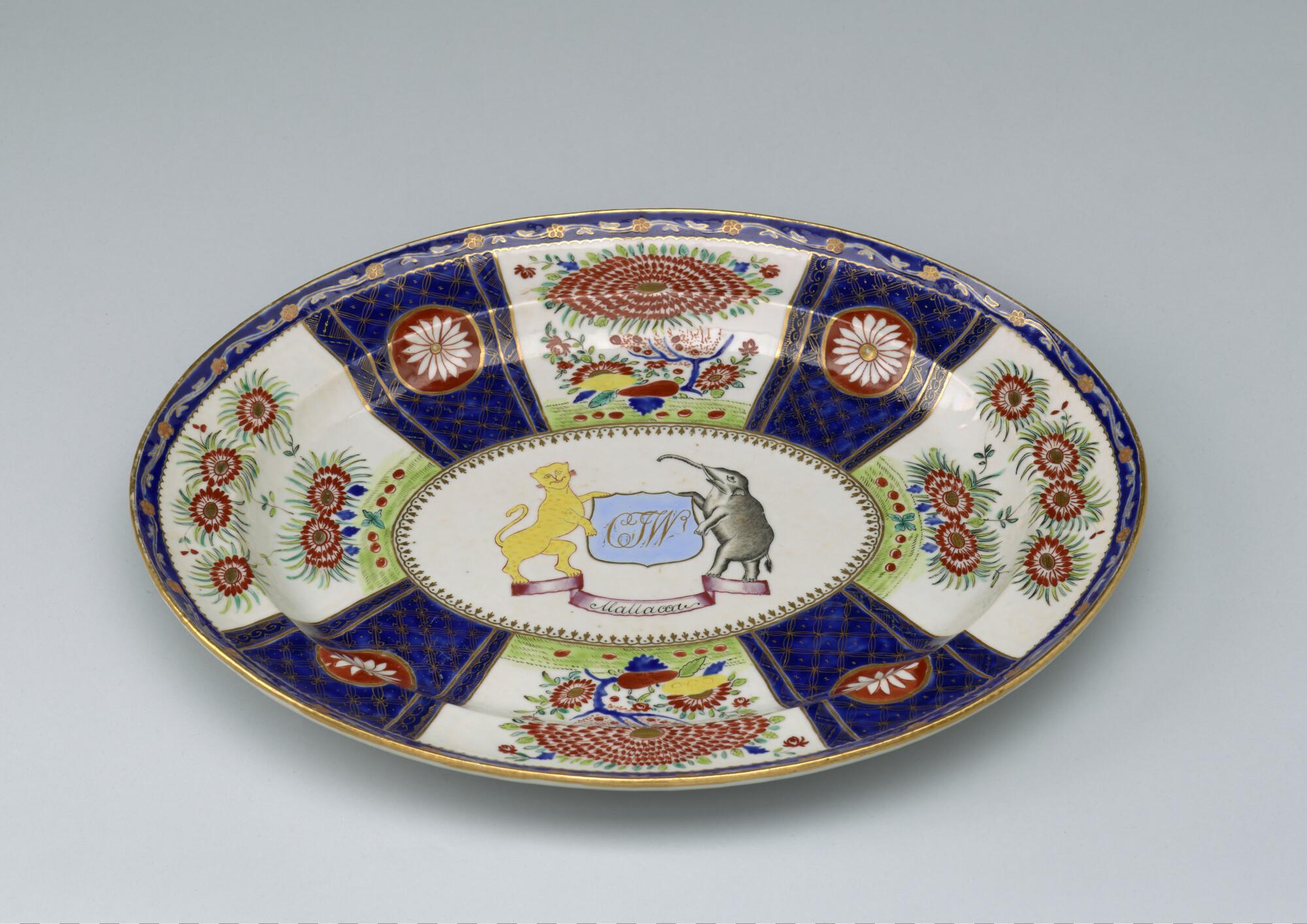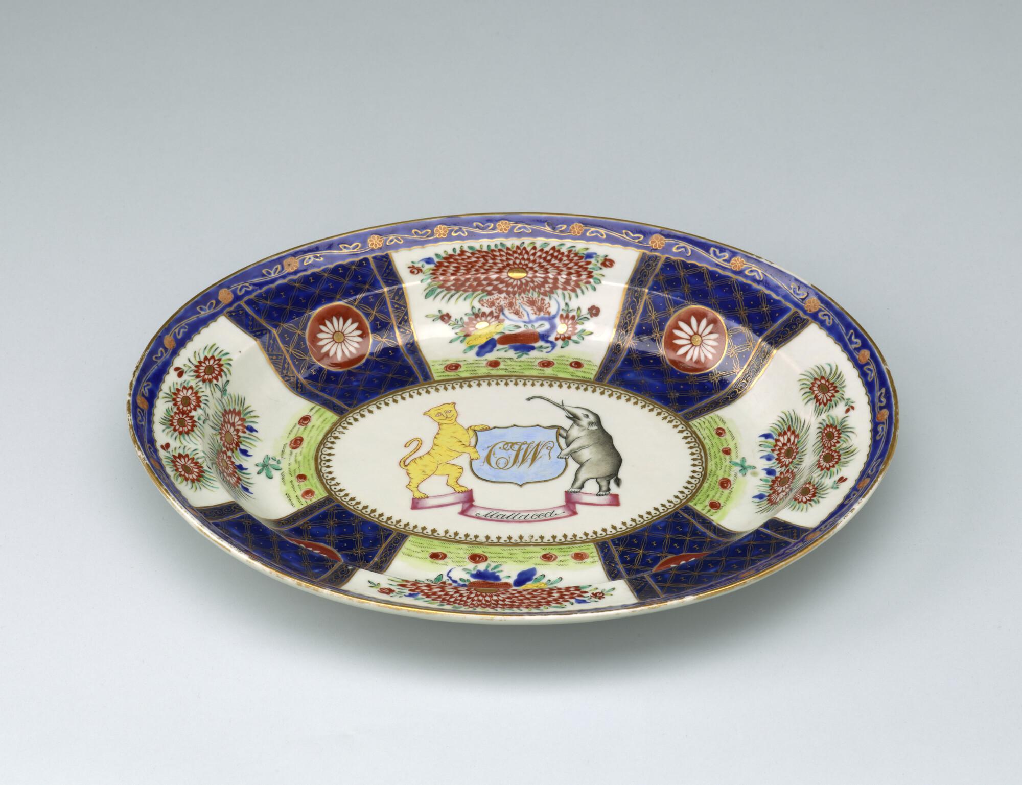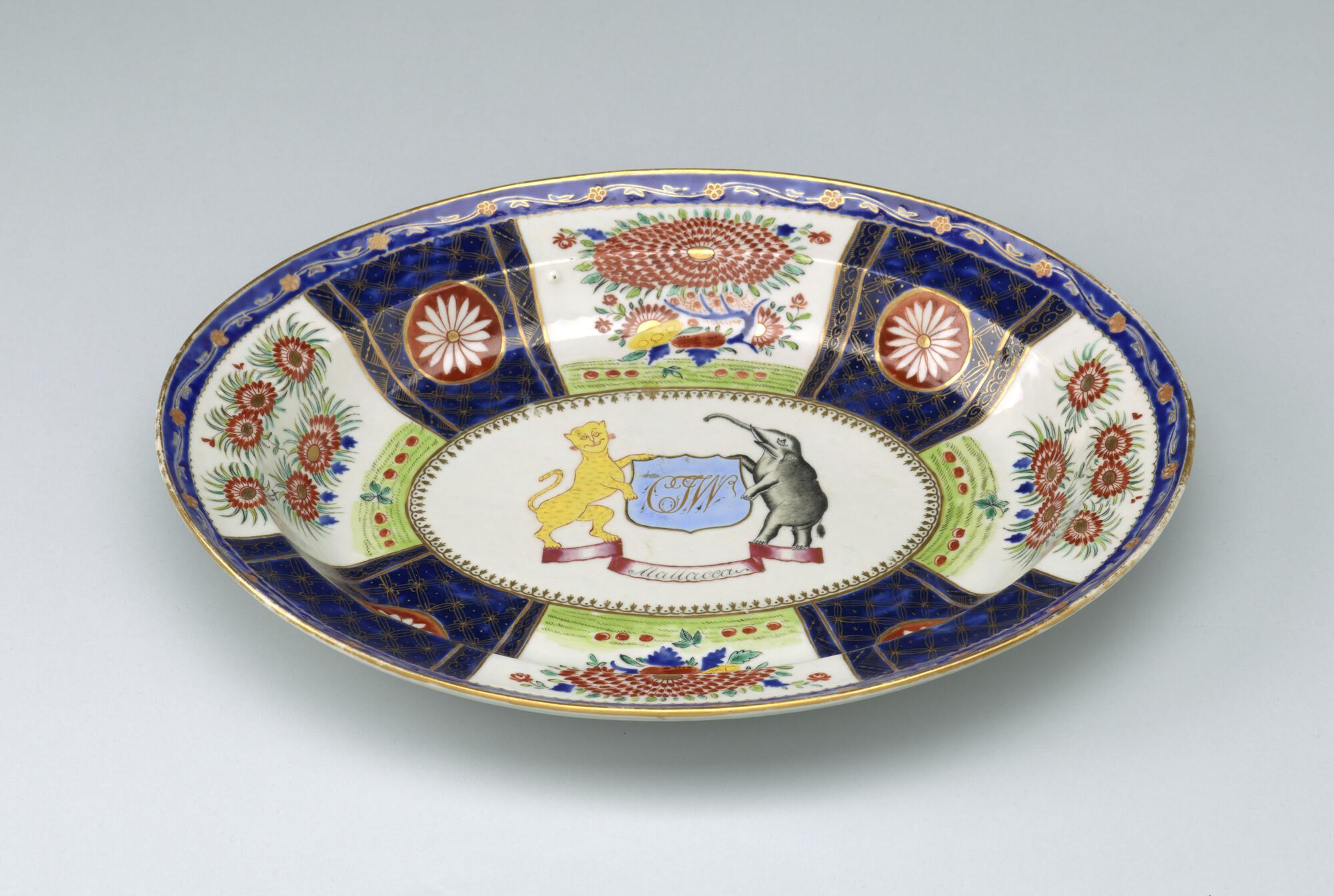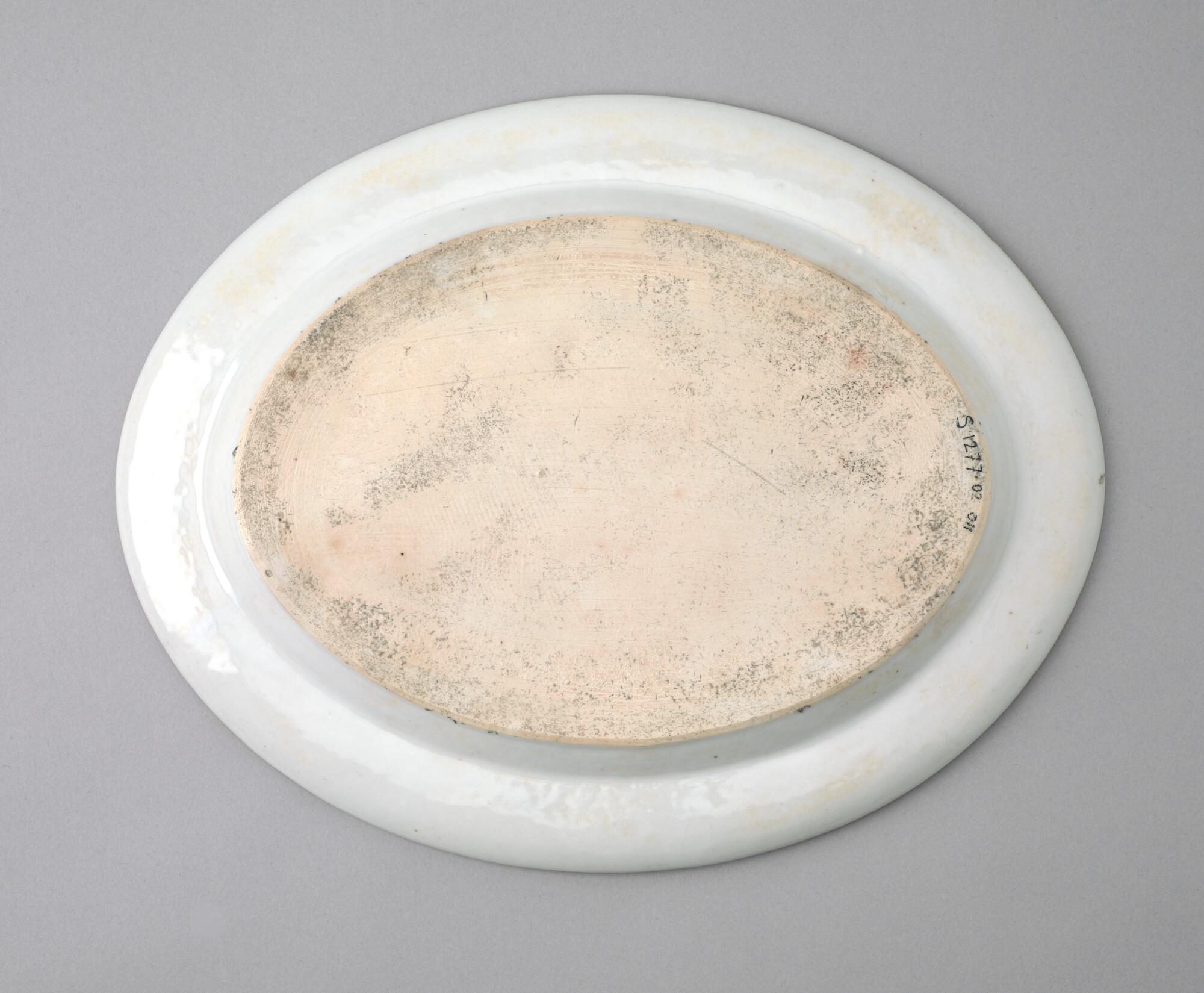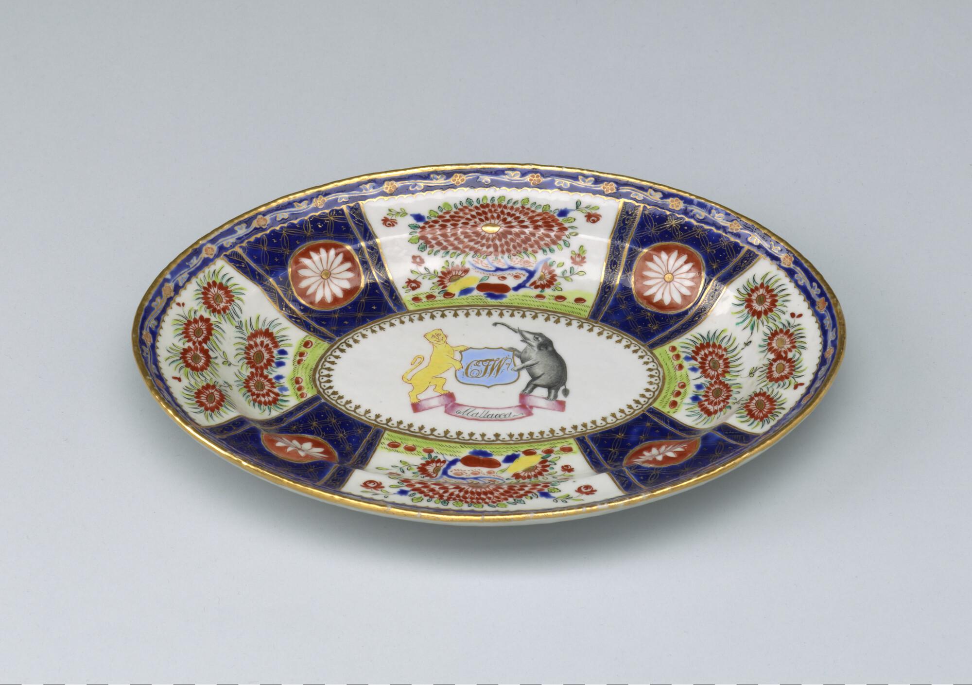Ovale schaal gedecoreerd met polychroom wapenschild