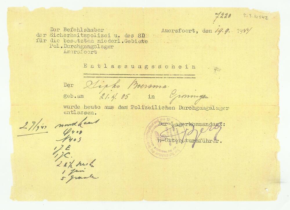 "Entlassungsschein" van Sipko Boersma, die op 19.9.1...
