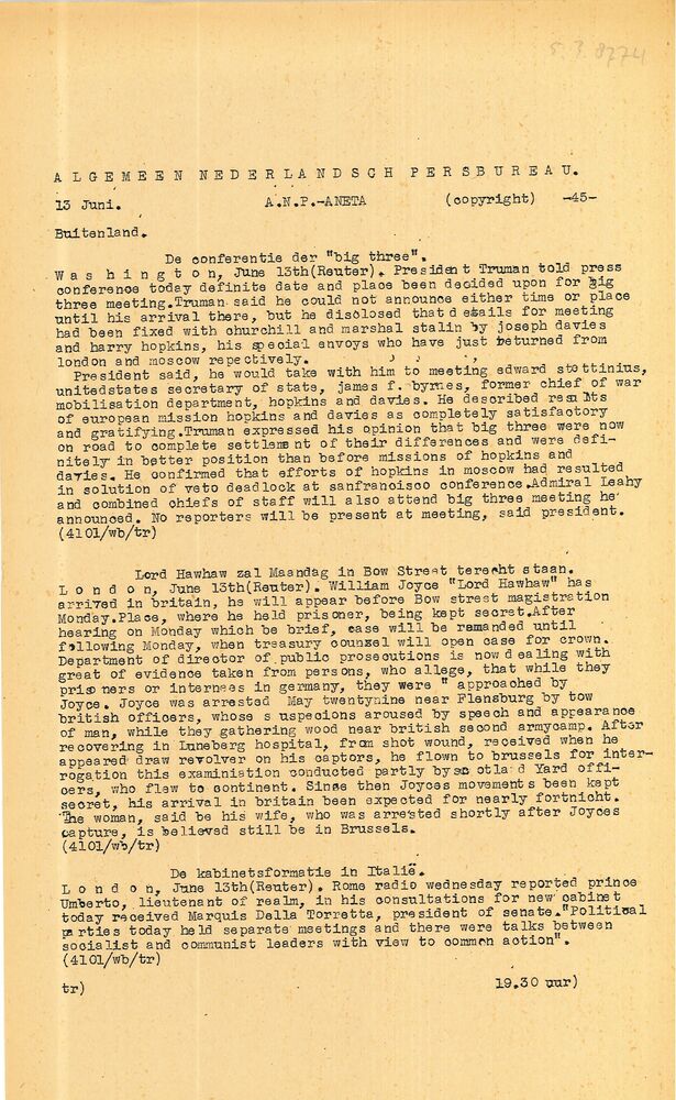 Vel: Algemeen Nederlandsch Persbureau, mededelingen,...