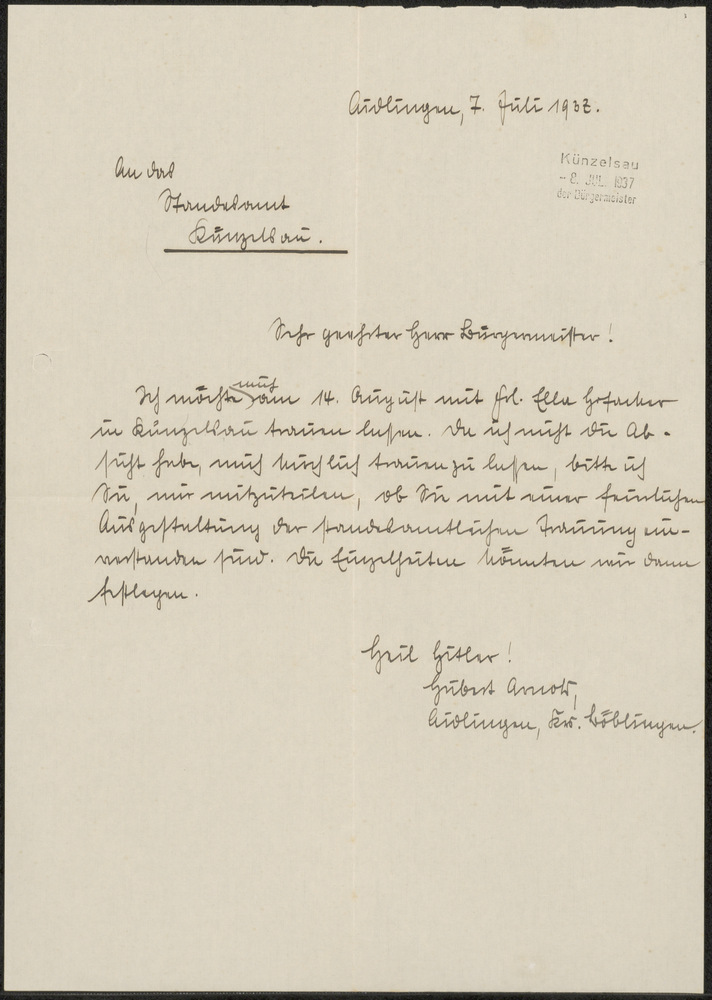 Brief van Hubert aan de burgermeester van Künzelsau ...