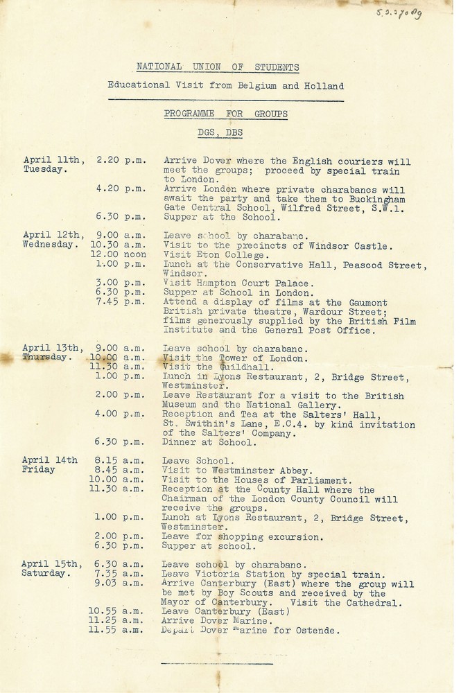Brief betreffende een schoolreis naar Engeland