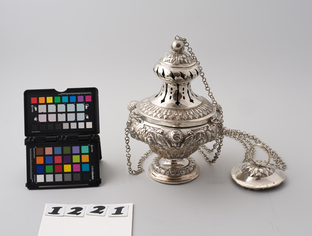 Wierookvat van gedreven zilver, versierd met cherubk...