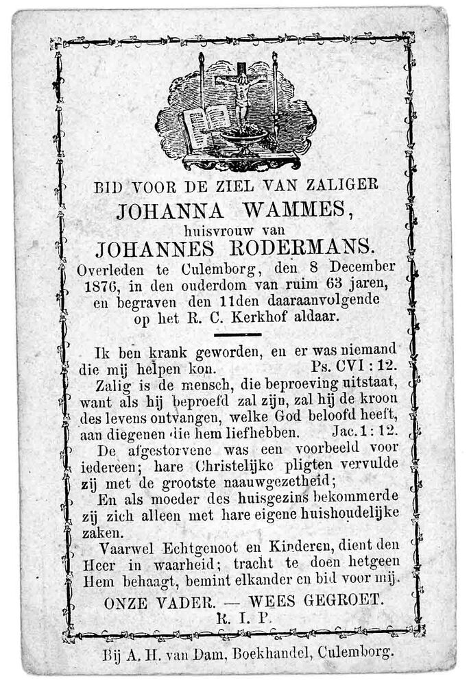 bidprent voor Johanna Wammes. Geboren 1813. Overlede...