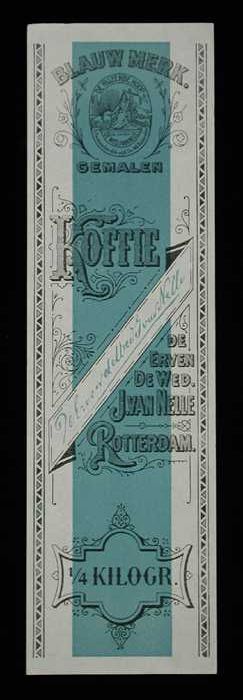 Blauw en wit, papieren label VAN NELLE BLAUWMERK KOF...