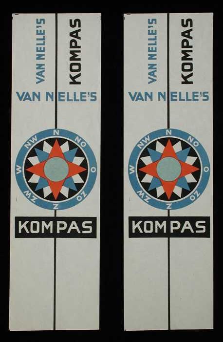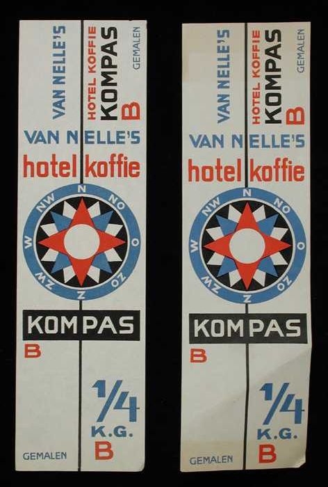 Twee witte, papieren labels VAN NELLE'S KOMPAS KOFFI...