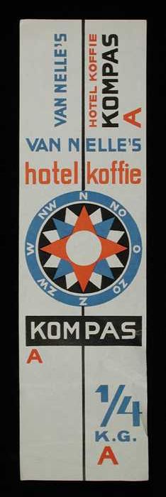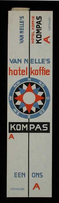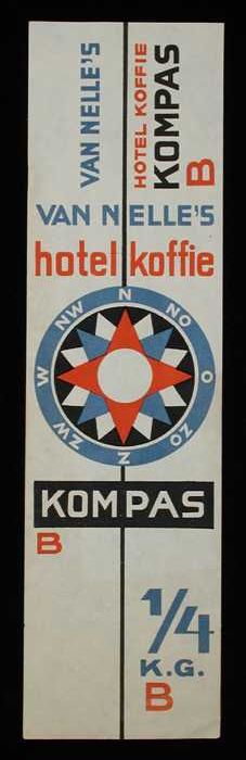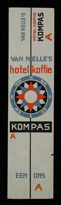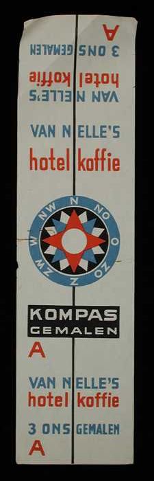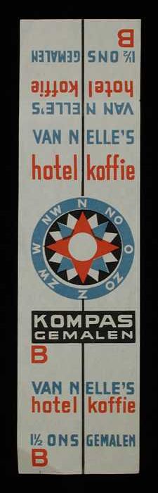 Wit, papieren label VAN NELLE'S KOMPAS KOFFIE, hotel...