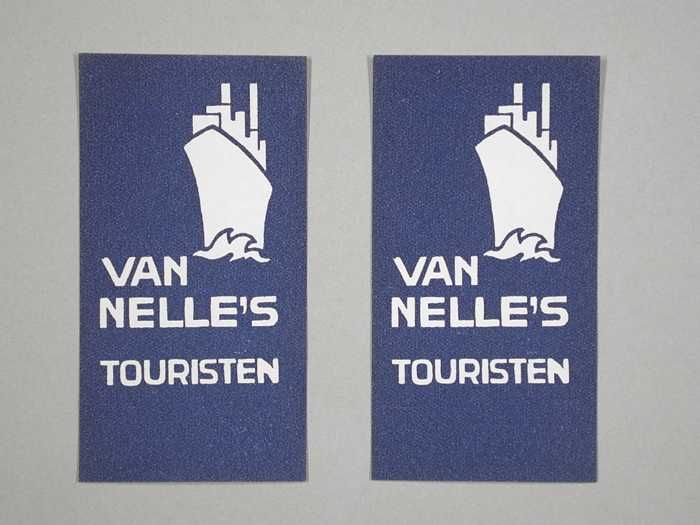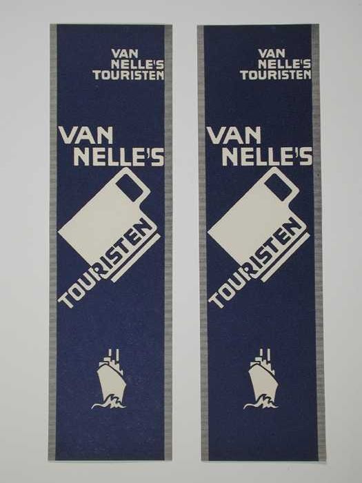 Twee donkerblauwe, papieren labels VAN NELLE'S TOURI...