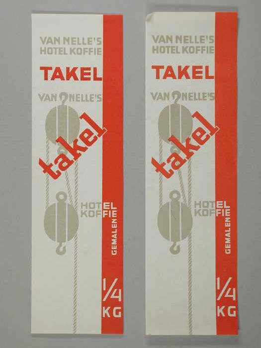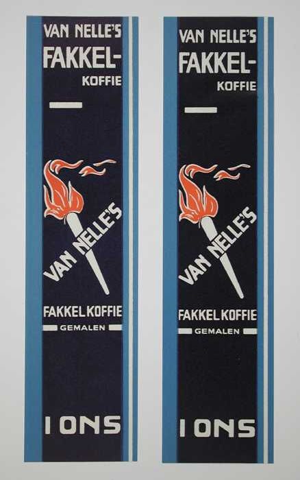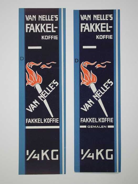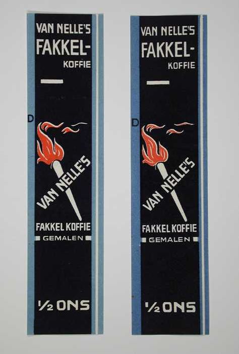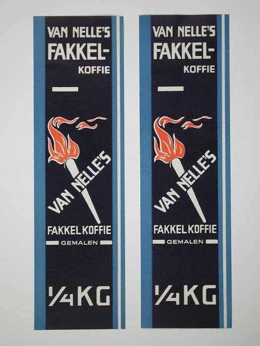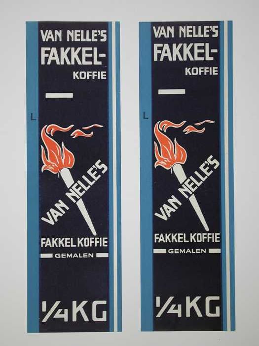 Twee papieren labels VAN NELLE'S FAKKEL KOFFIE, 100 ...