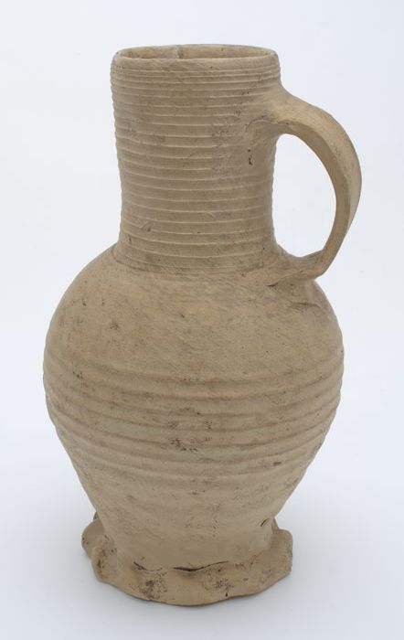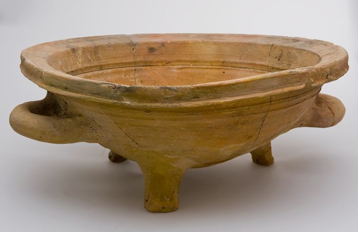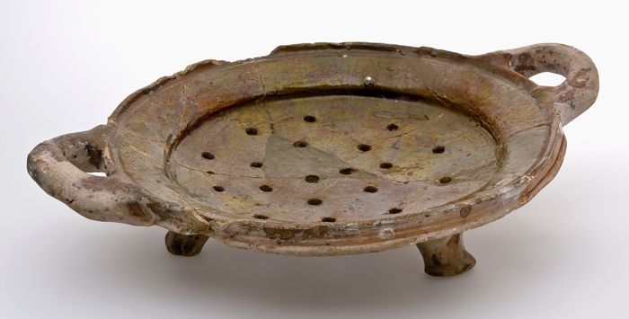 Aardewerk vergiet, op drie poten, met twee oren