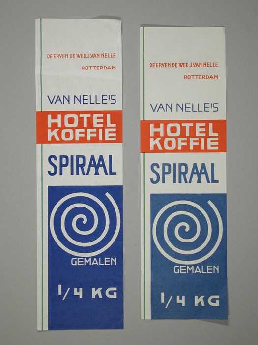 Twee papieren labels VAN NELLE'S SPIRAAL KOFFIE, hot...