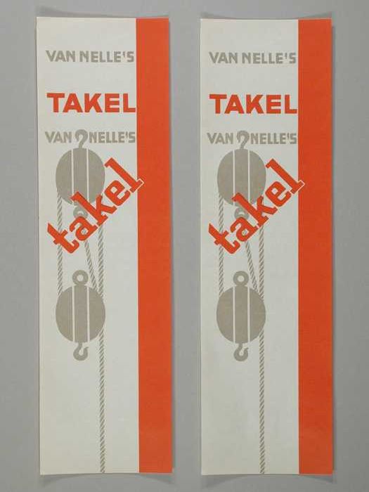 Twee kleine, donkerblauwe, papieren labels VAN NELLE...