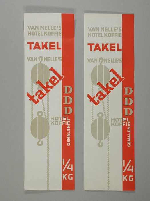 Twee papieren labels VAN NELLE'S FAKKEL KOFFIE, D, 2...