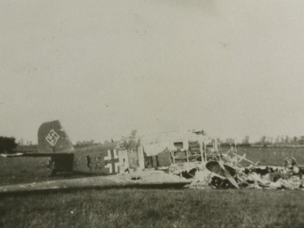 Foto van uitgebrand wrak van Junkers Ju 52 in weilan...