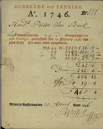 Kwitantie, 100e penning, 1746