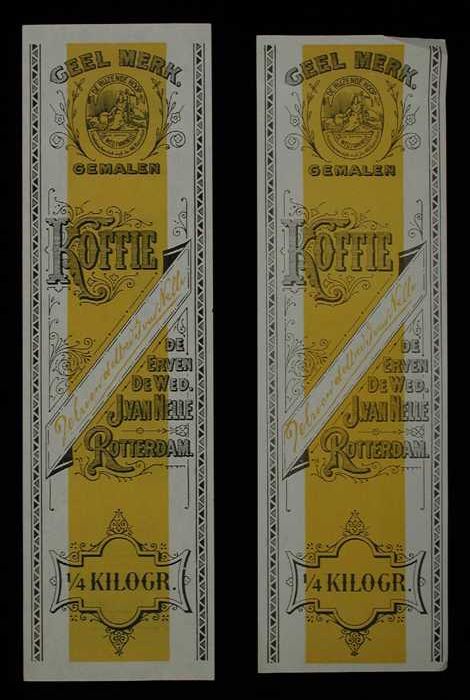 Twee wit en gele, papieren labels VAN NELLE GEELMERK...