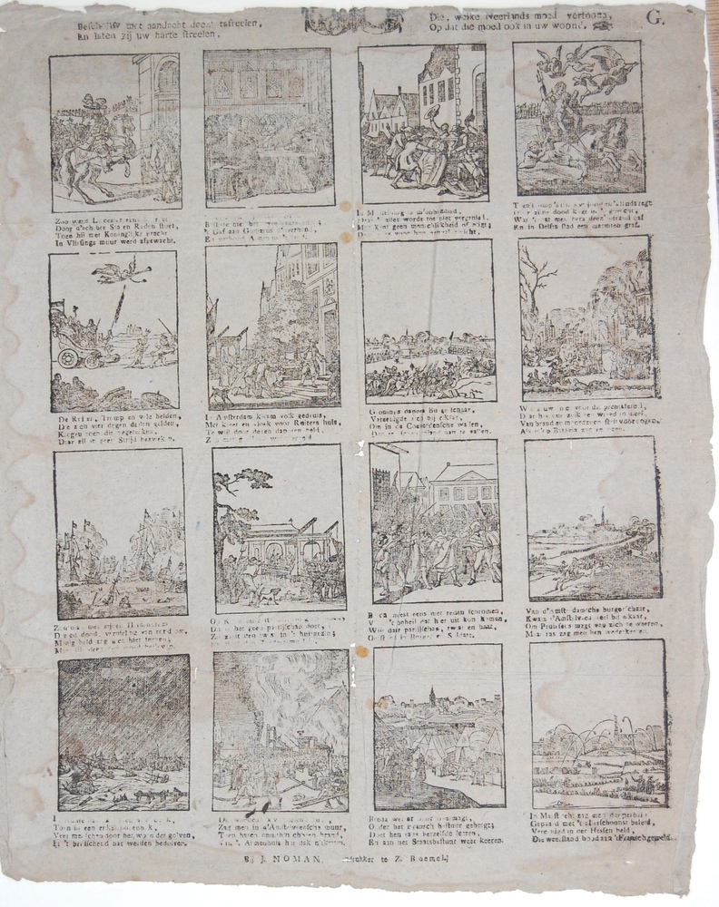 Centsprent met zestien prentjes over Neerlands moed....