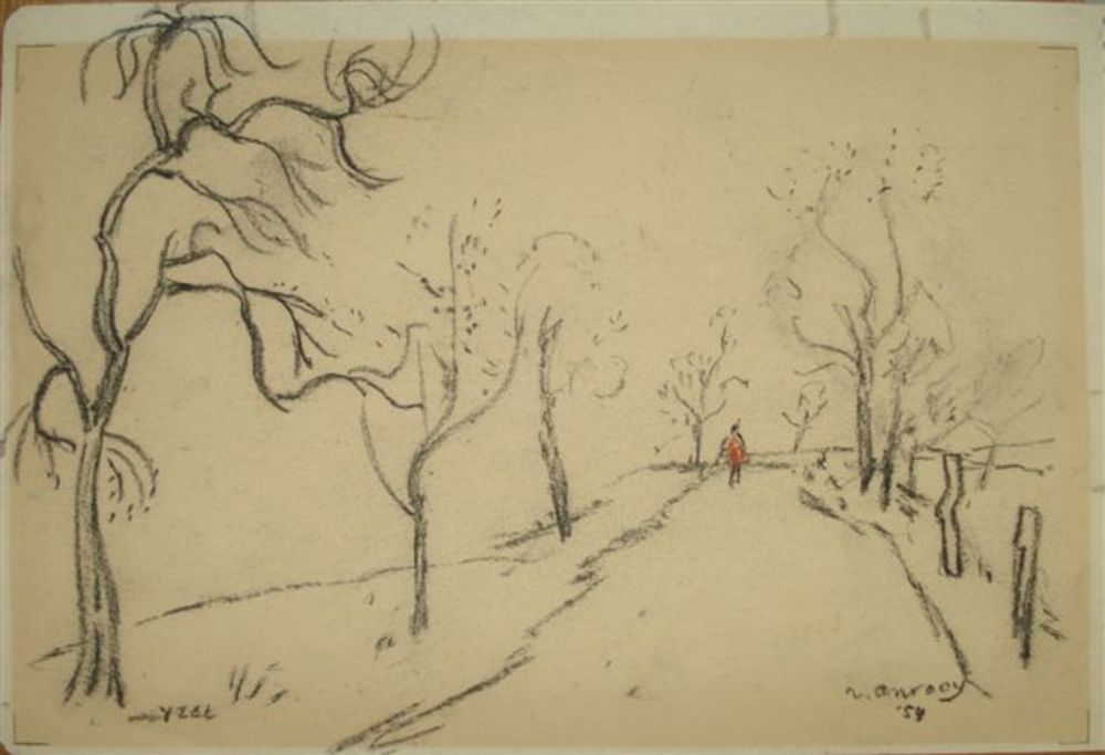 krijttekening veldweg met persoon, Jan van Anrooy 1954