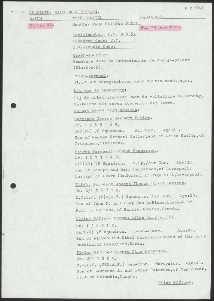 Rapport Halifax LV905 No. 78, R.A.F. Squadron 25 mei...