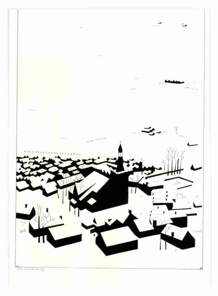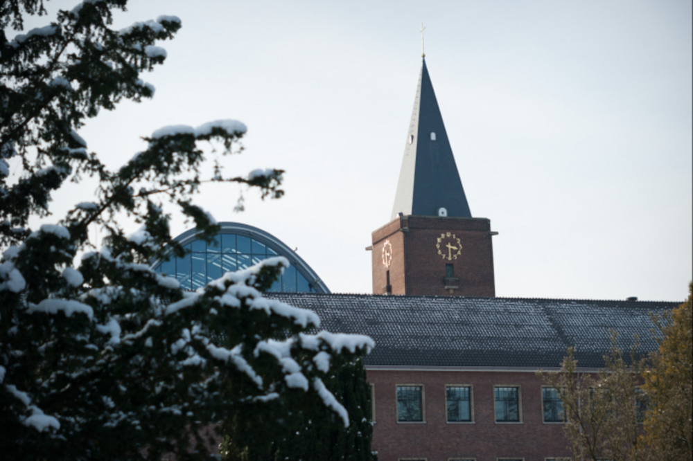 Stadsgezicht met kerk in de sneeuw