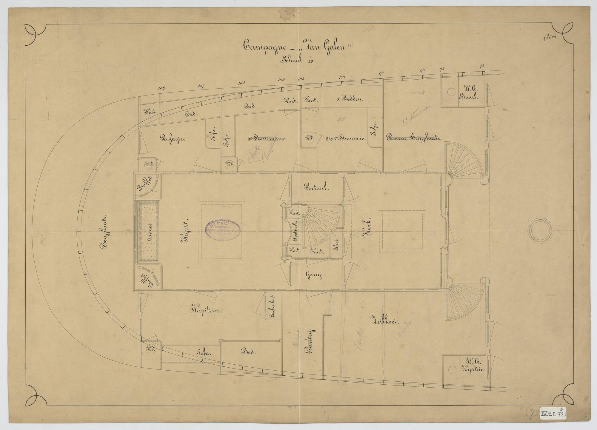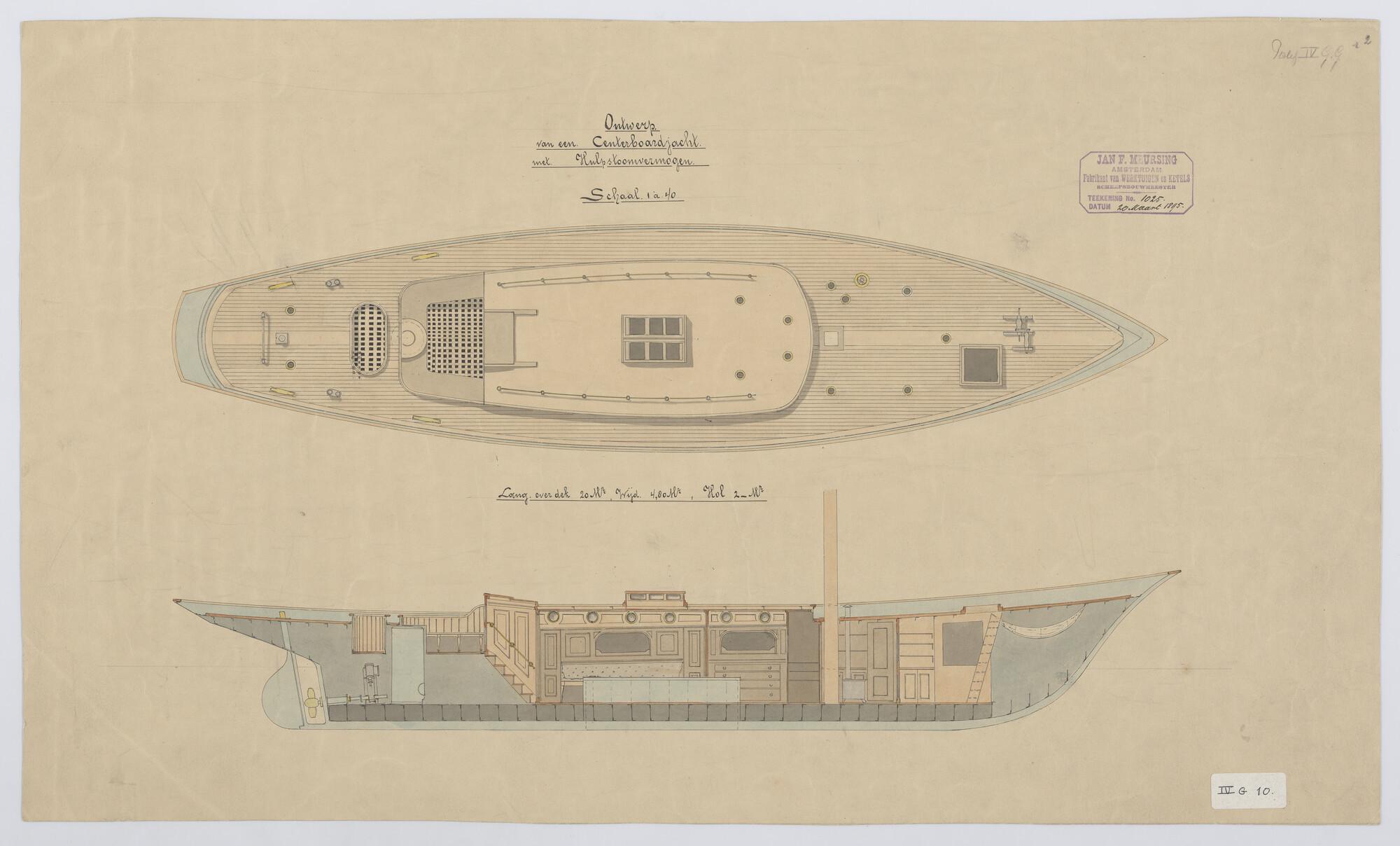Indelingsplan van een centerboardjacht met hulpstoom...