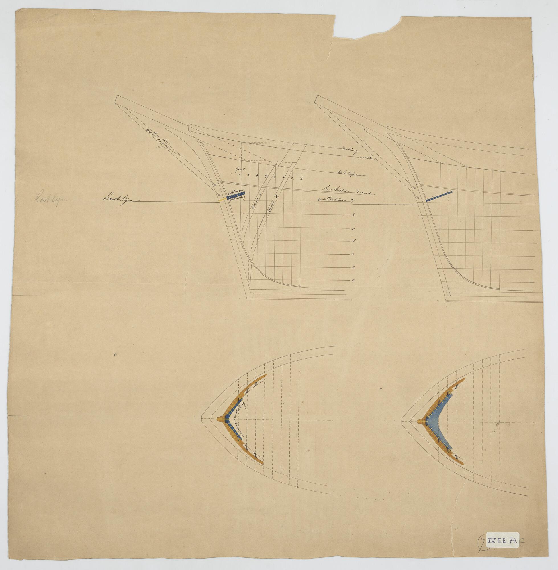 Verticale langsdoorsnede, bovenaanzicht, waterlijnen...