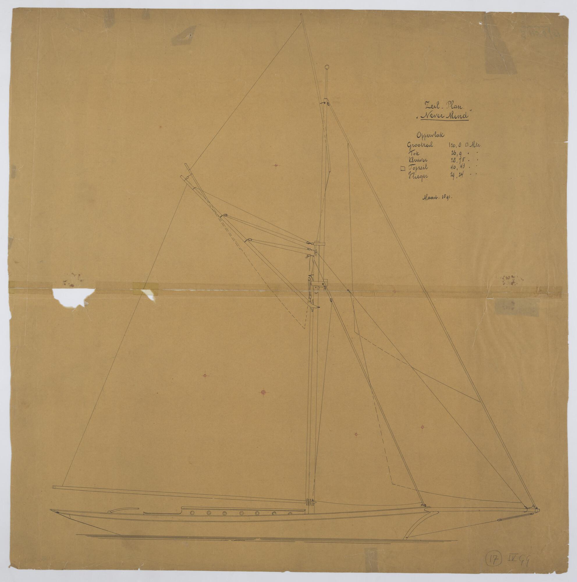 Zijaanzicht en lijnenplan van het Jacht 'Never Mind'