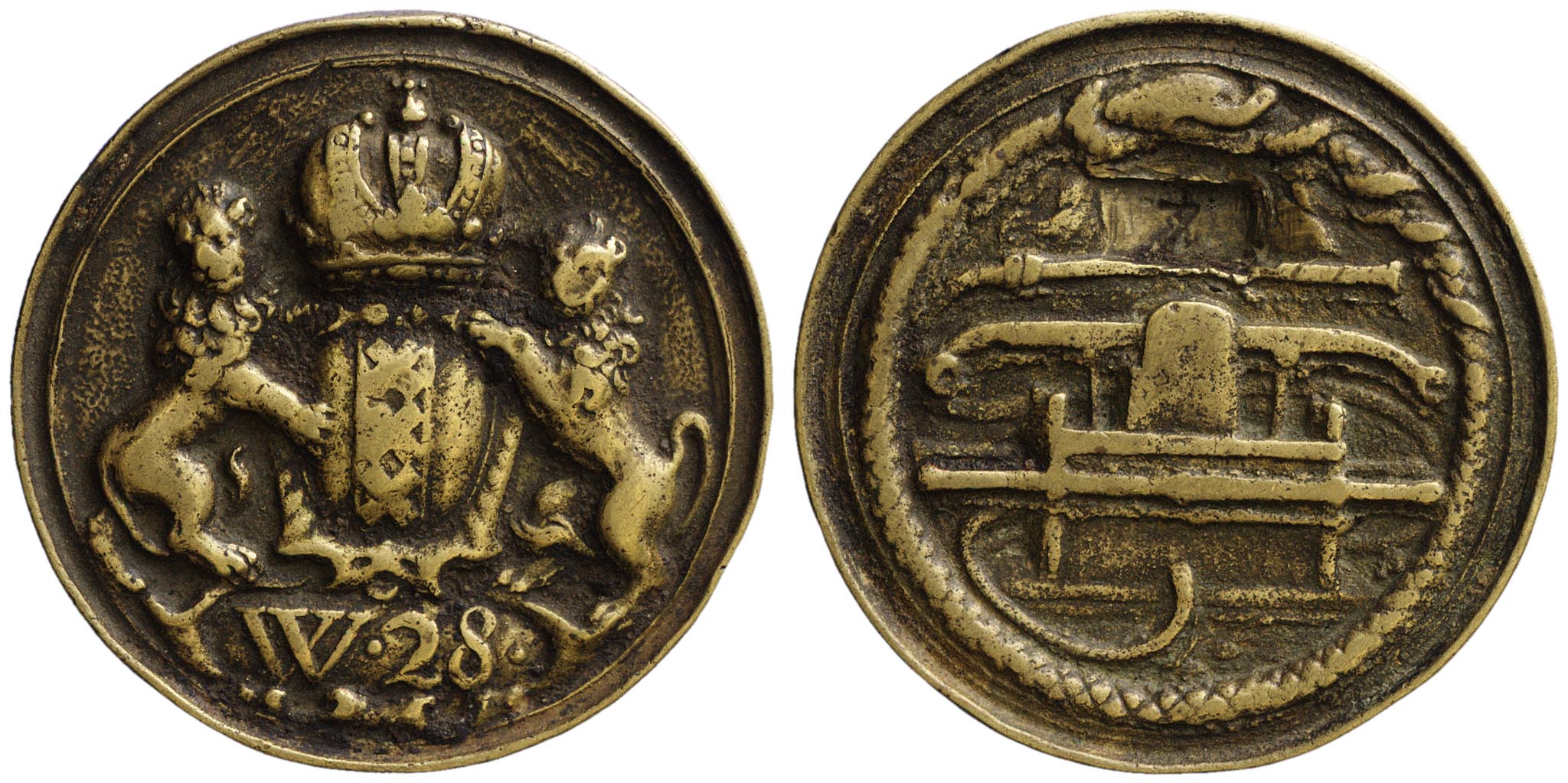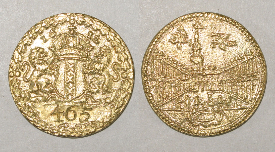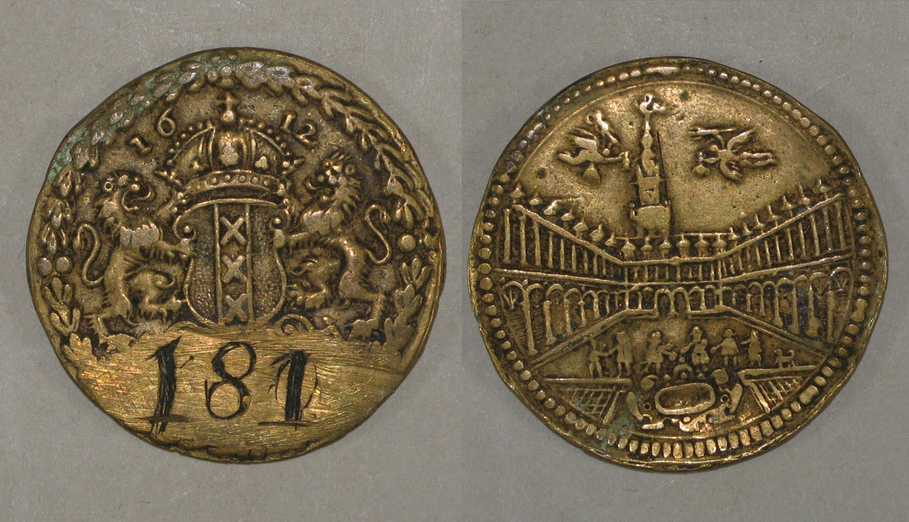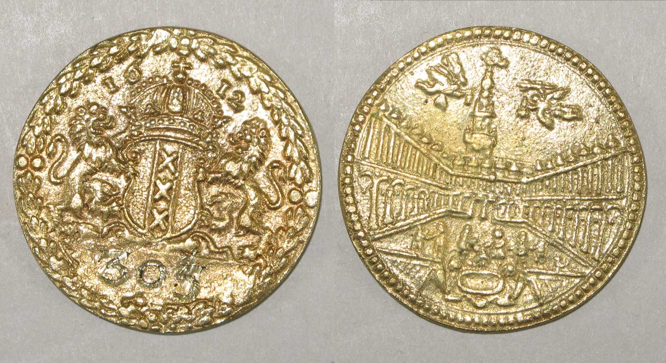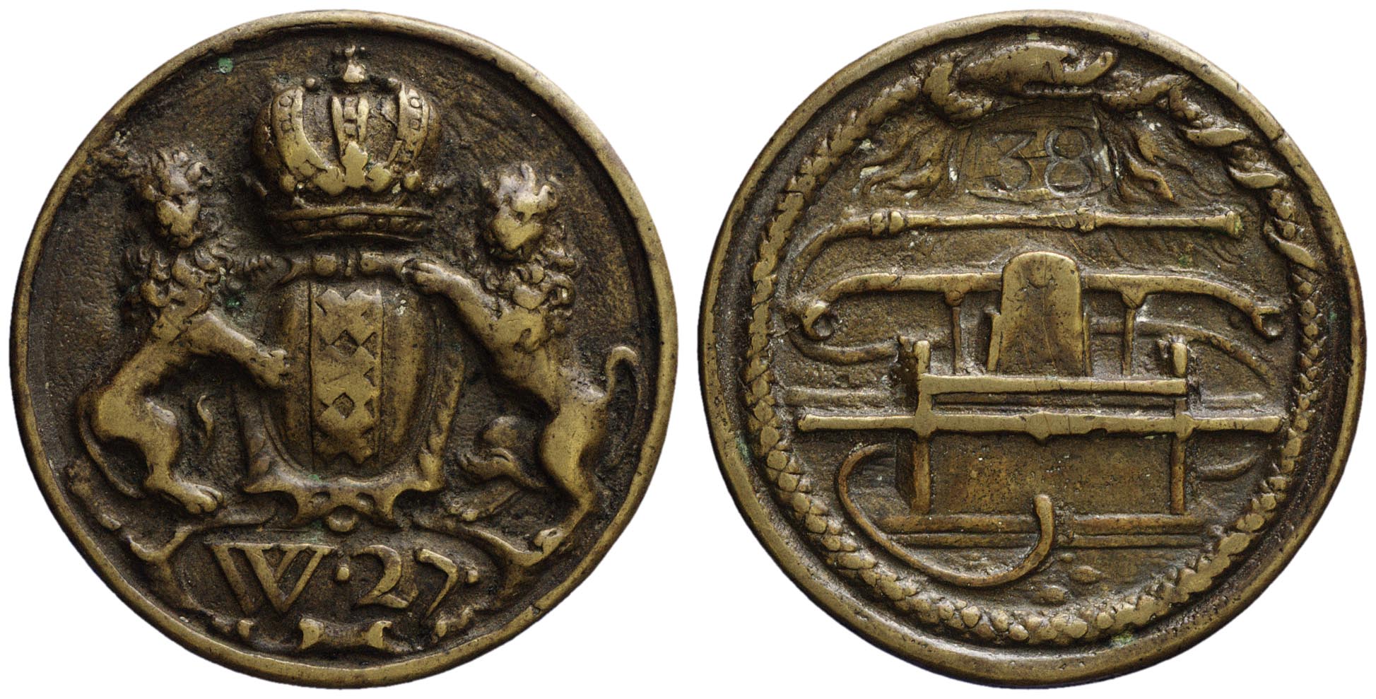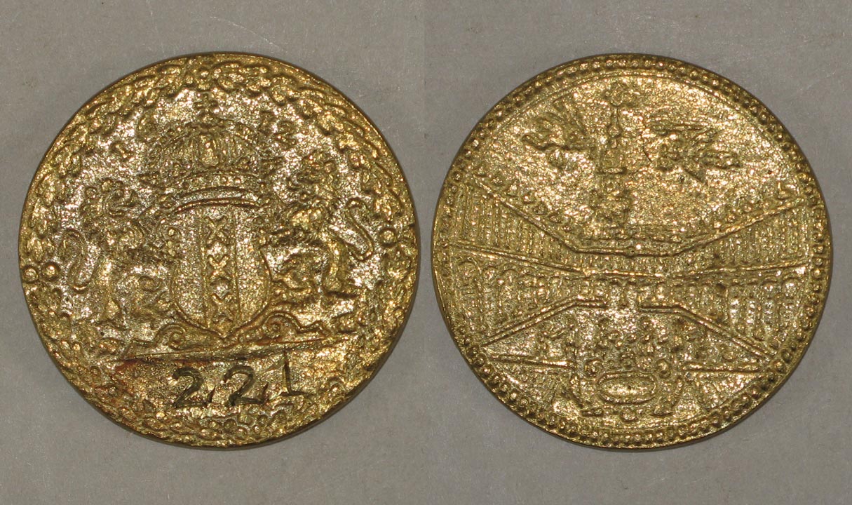 Twee makelaarsgildepenningen in papieren wikkel, nr. 61