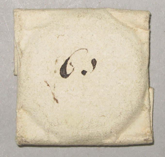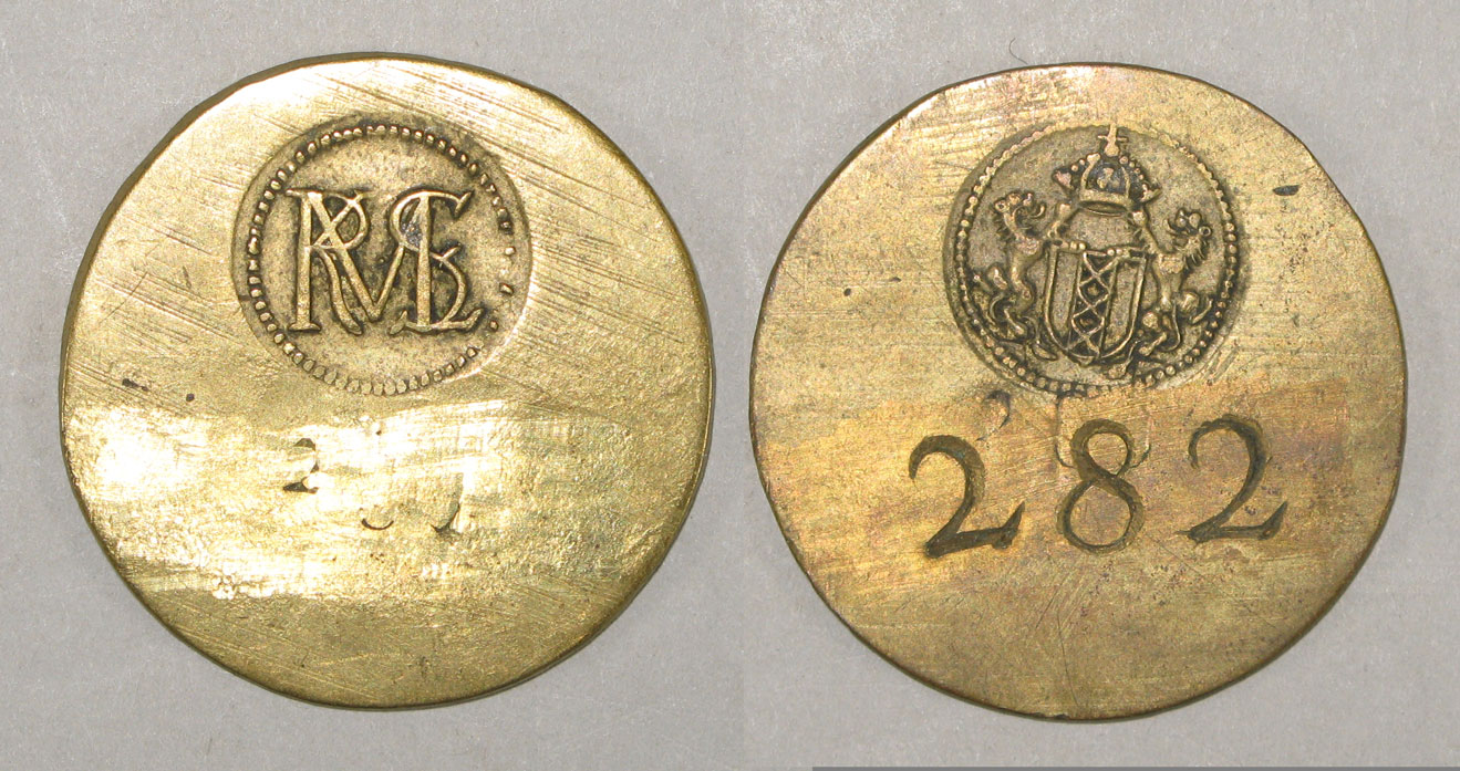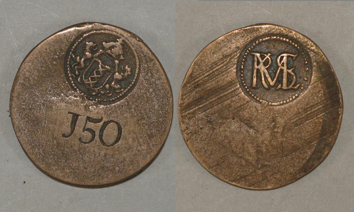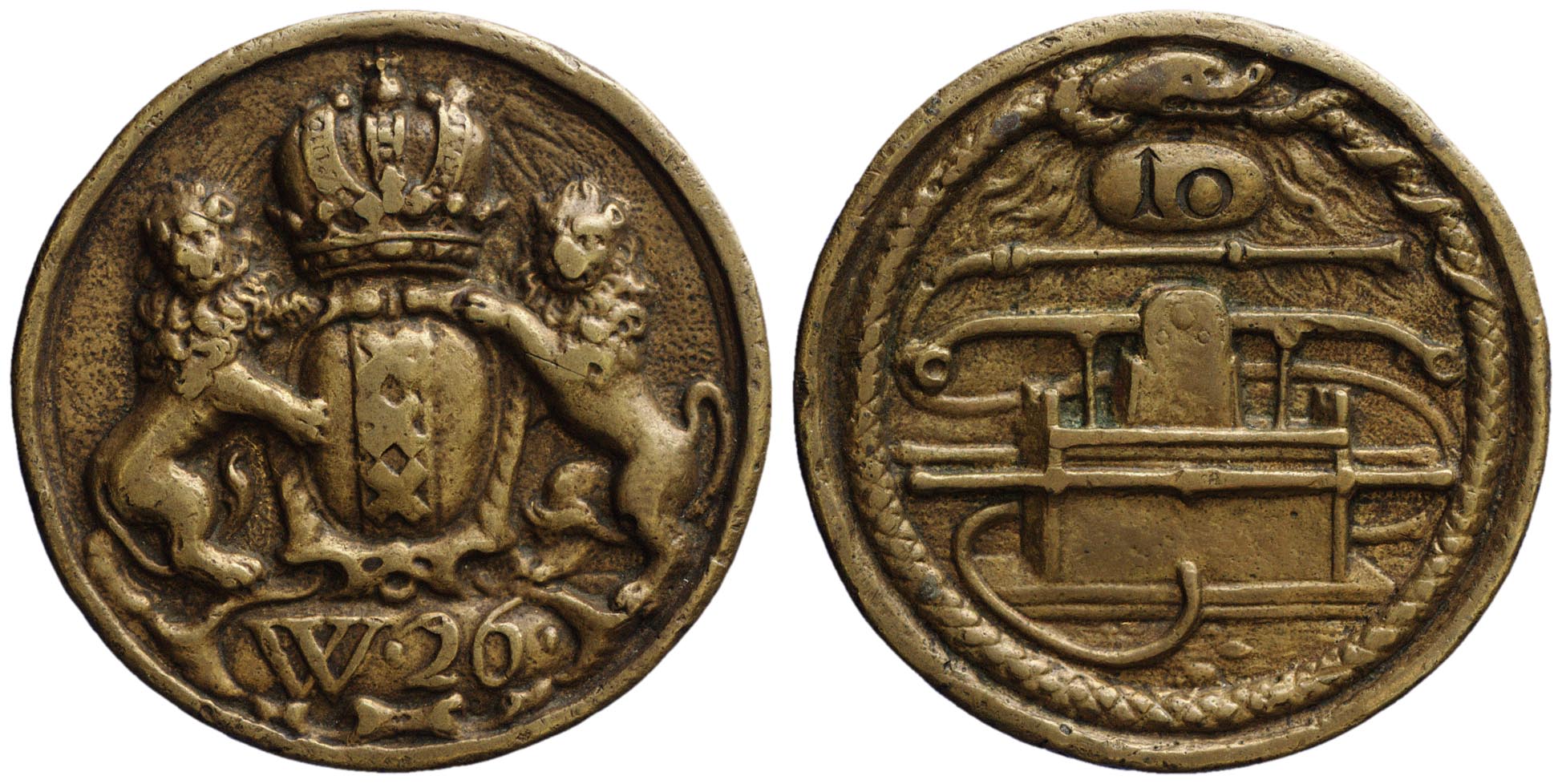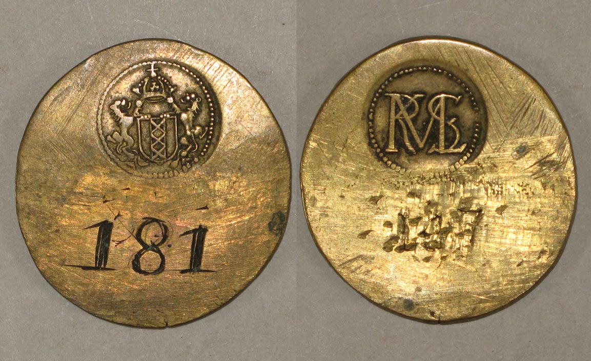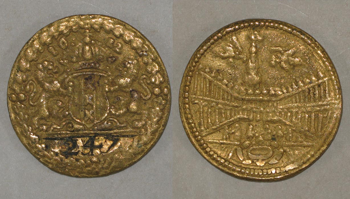 Twee makelaarsgildepenningen in papieren wikkel, nr. 61