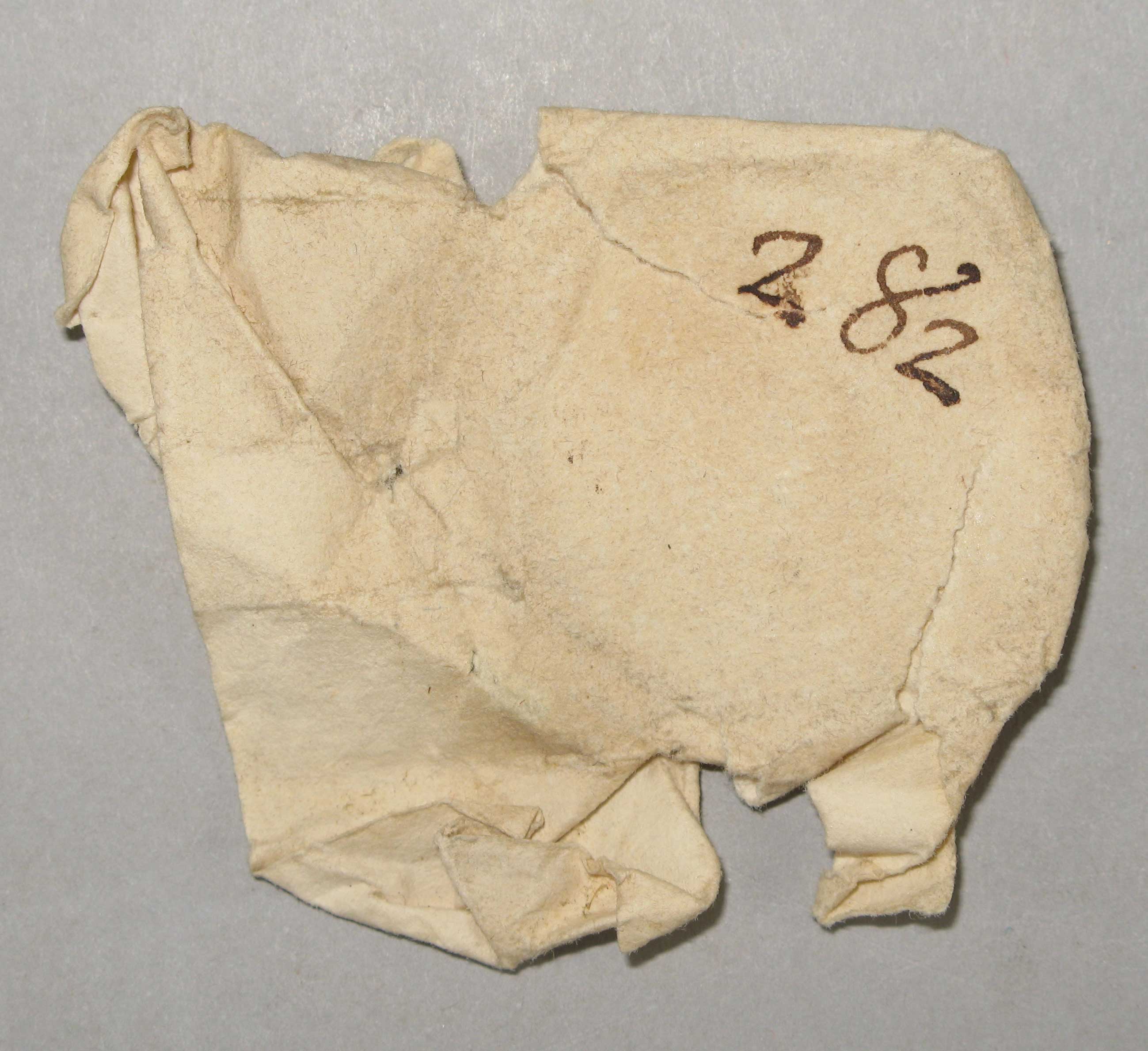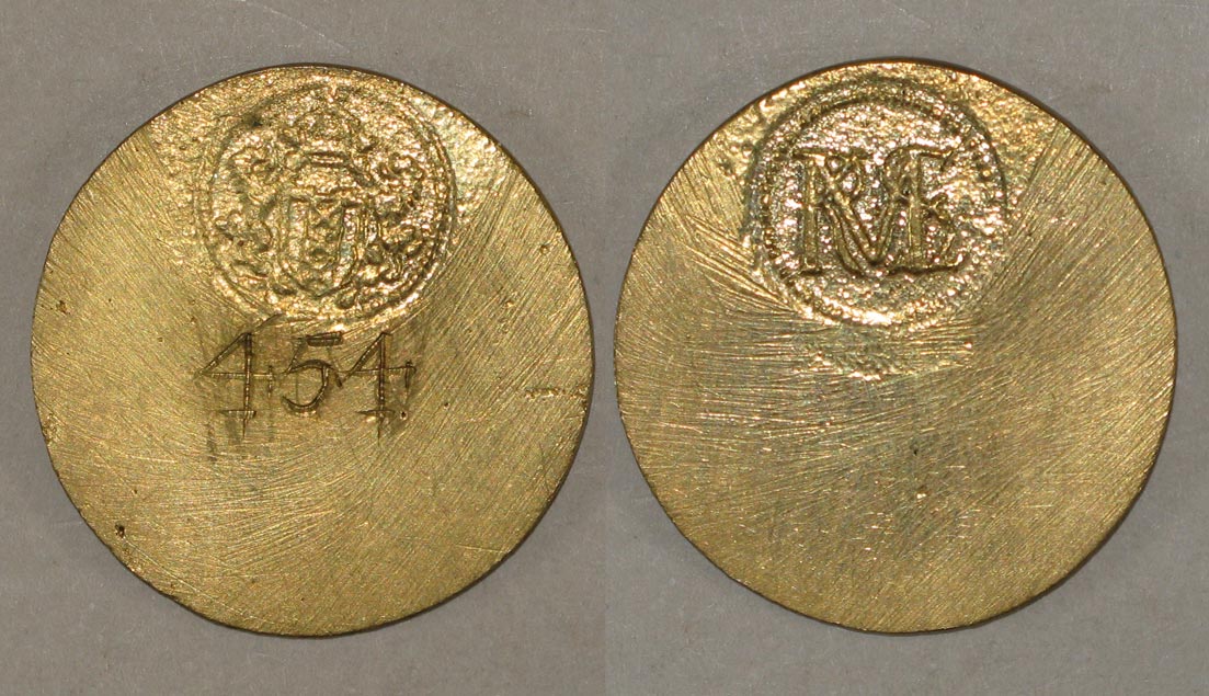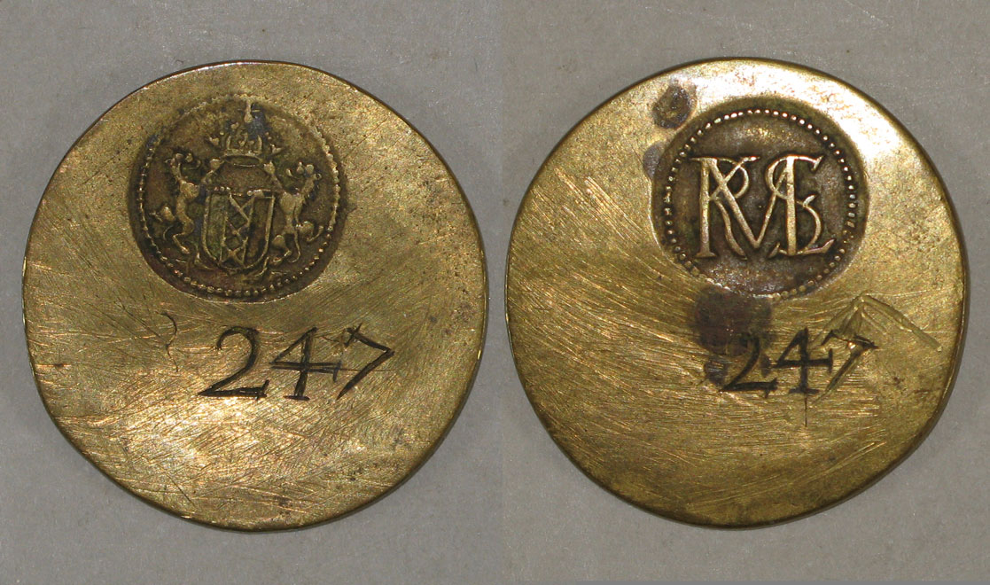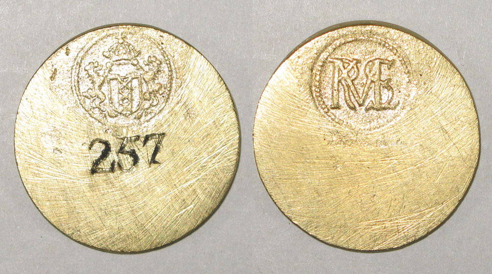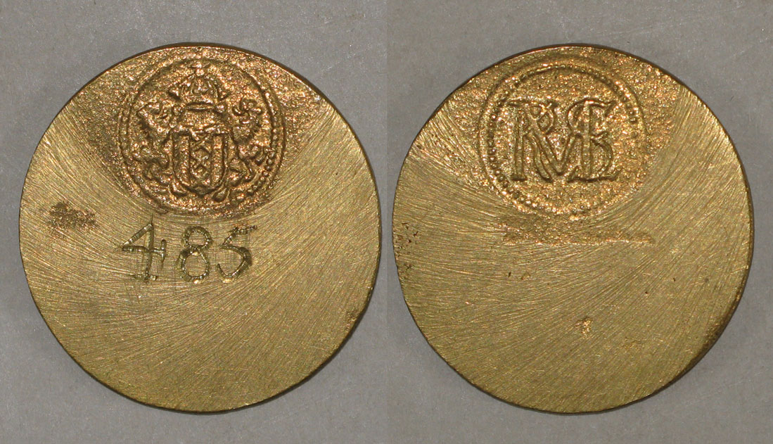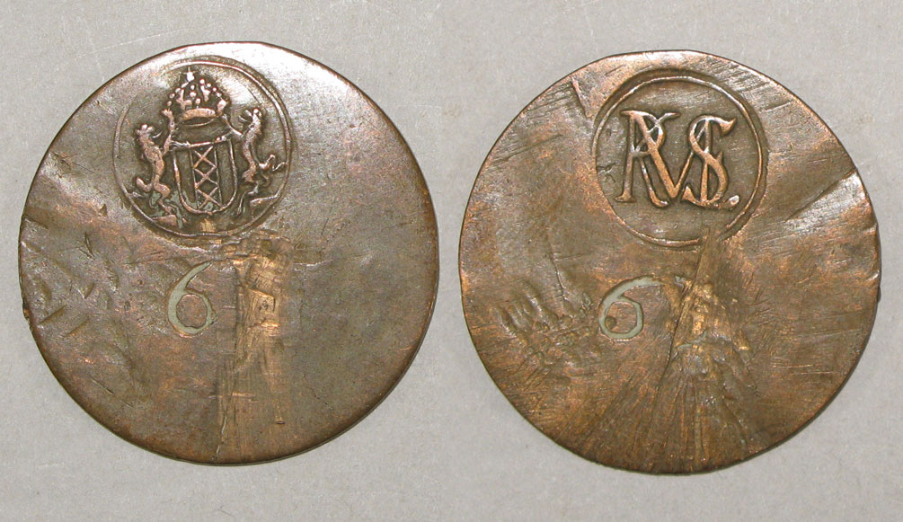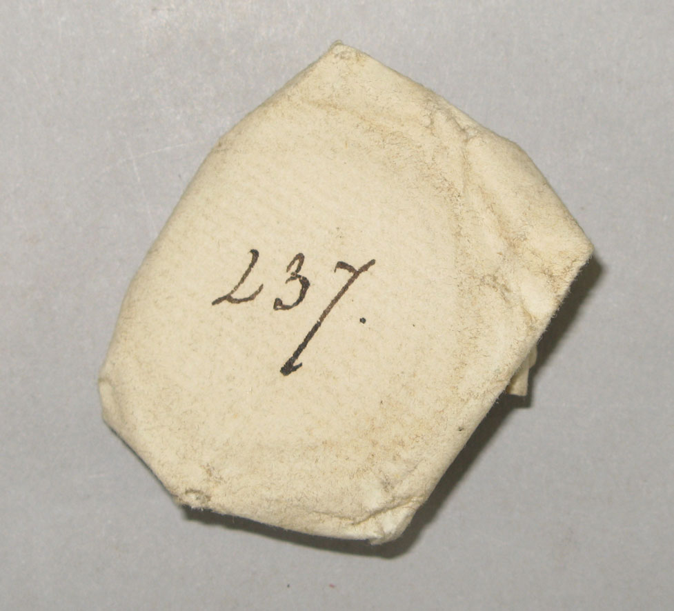 Twee makelaarsgildepenningen in papieren wikkel, nr. 61