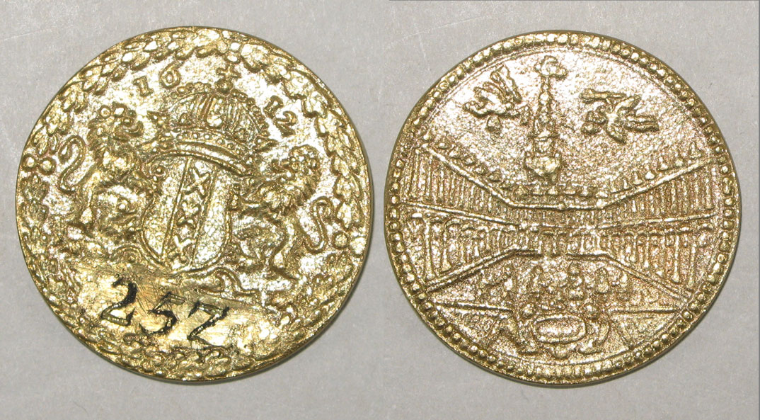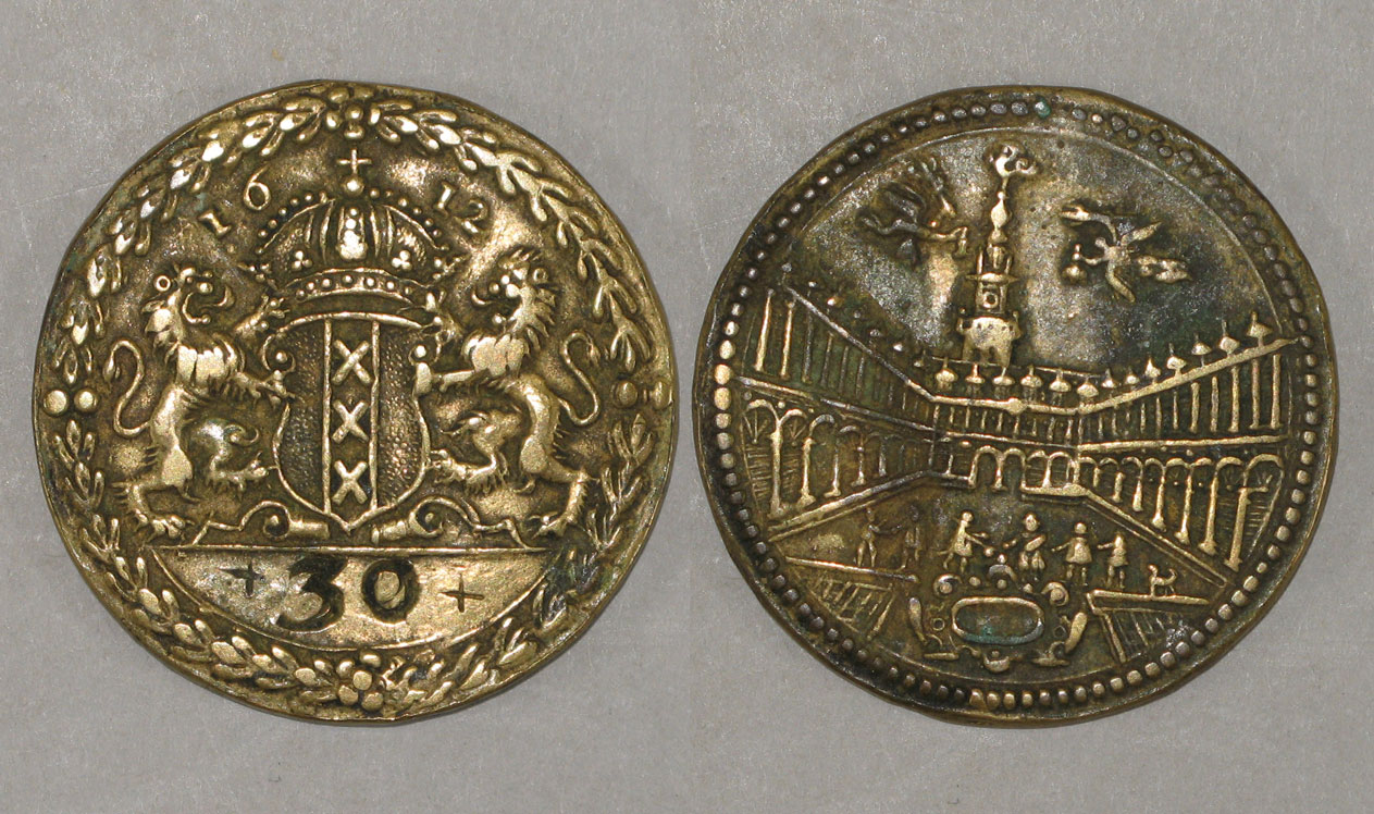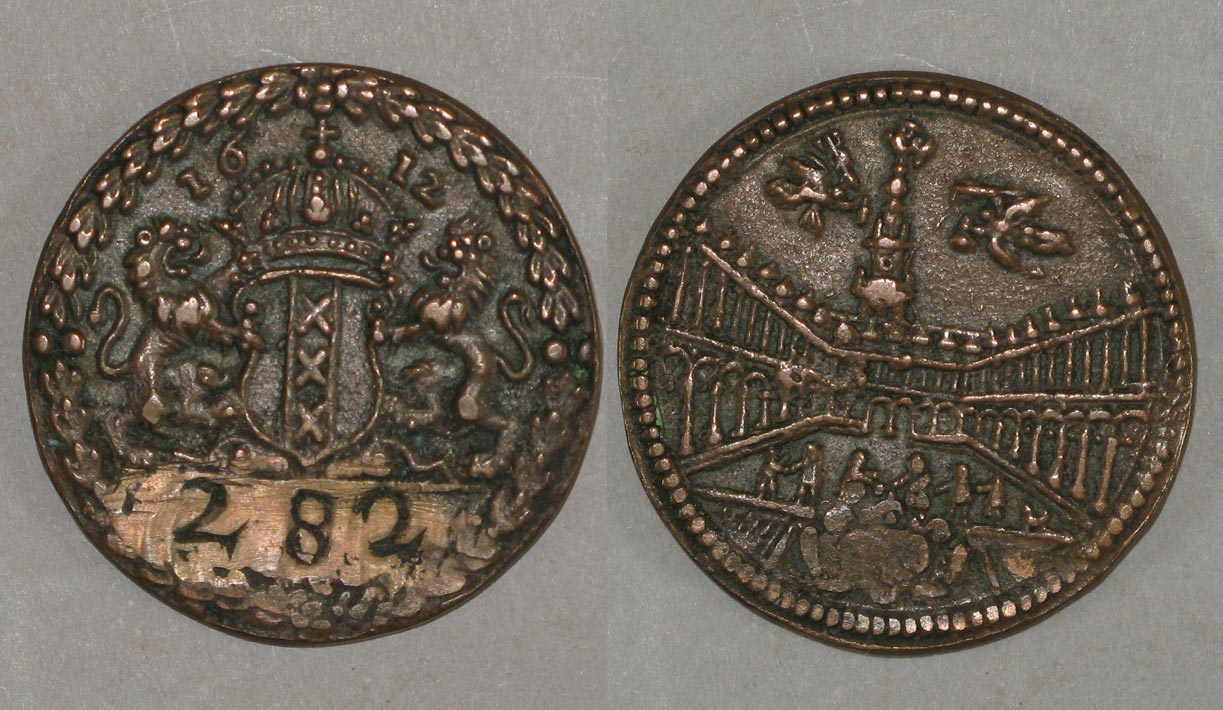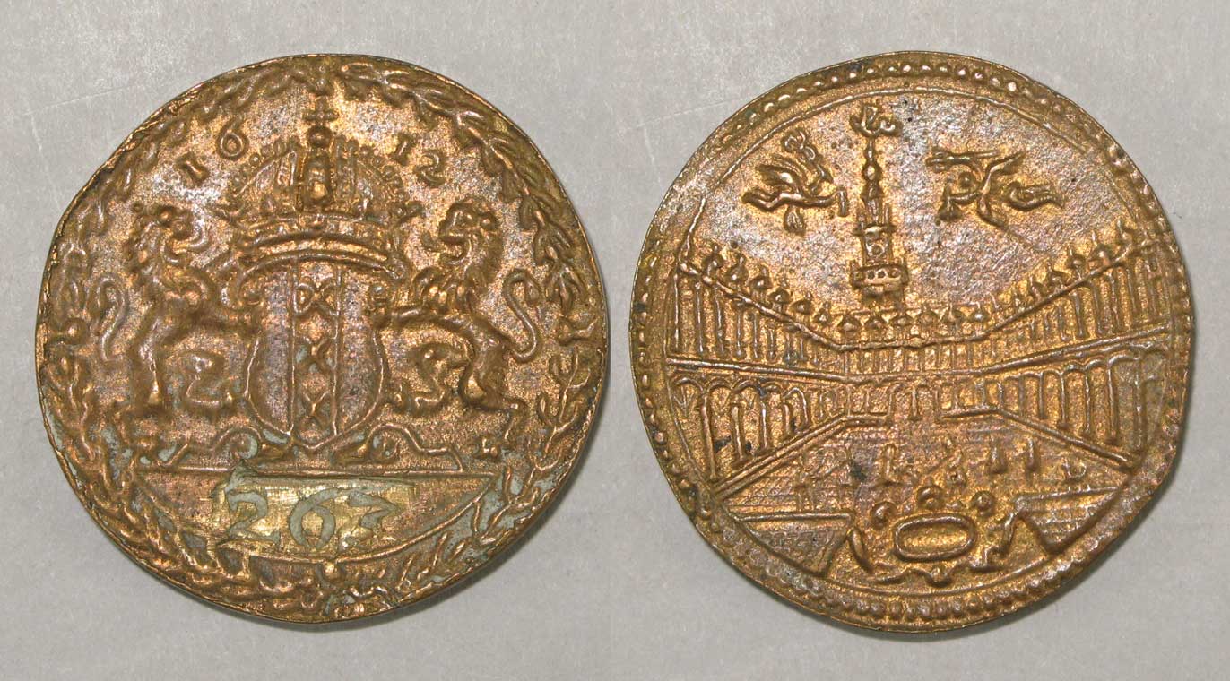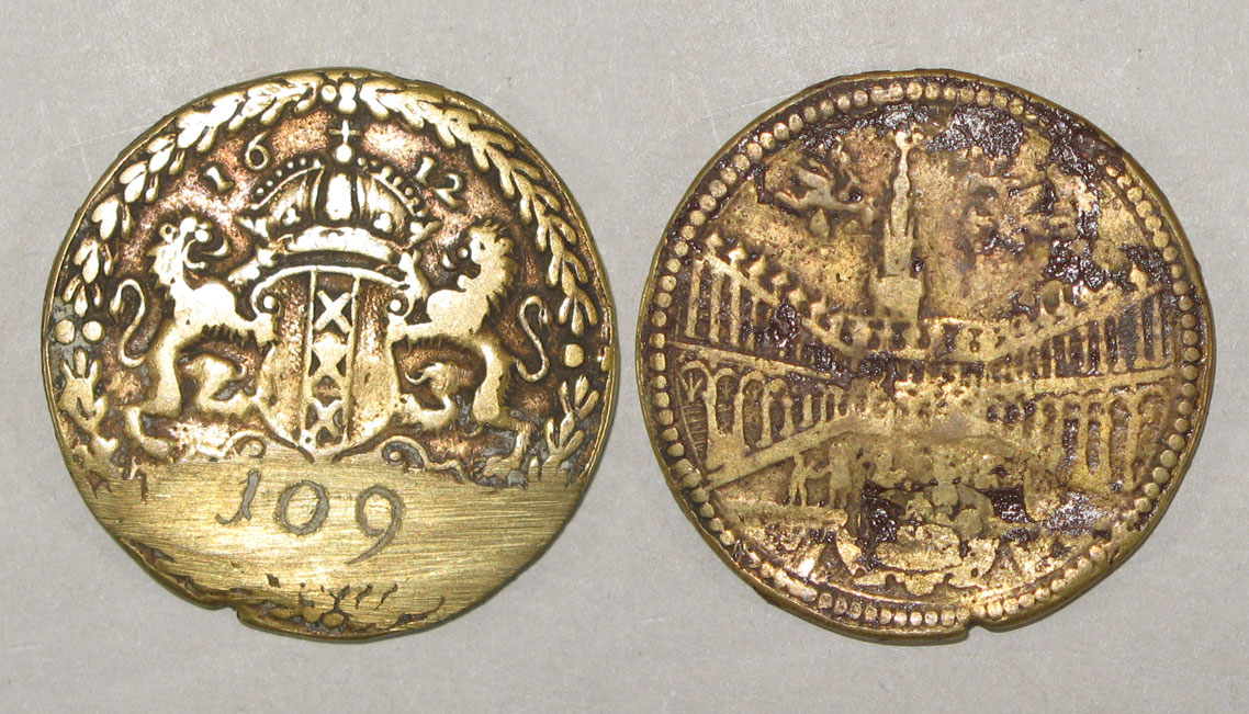 Twee makelaarsgildepenningen in papieren wikkel op n...