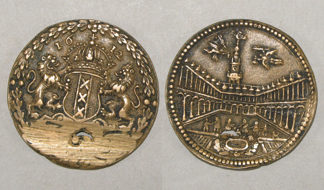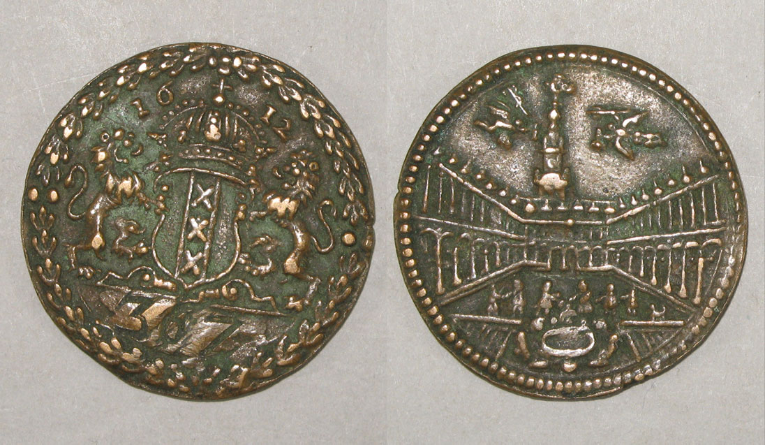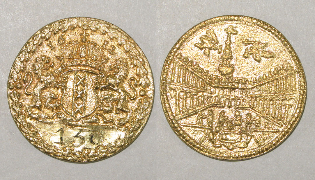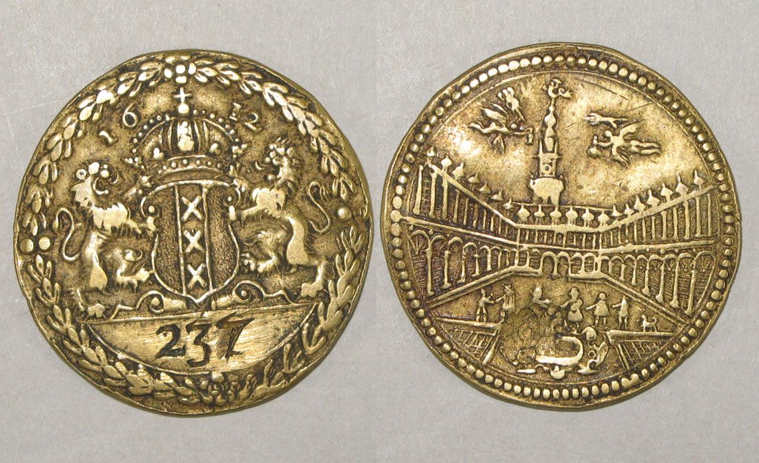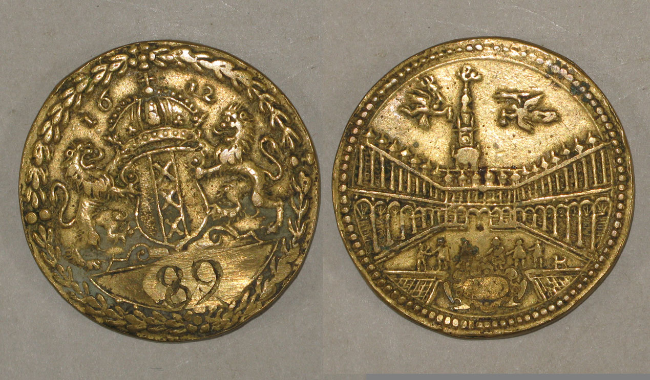 Twee makelaarsgildepenningen in papieren wikkel op n...