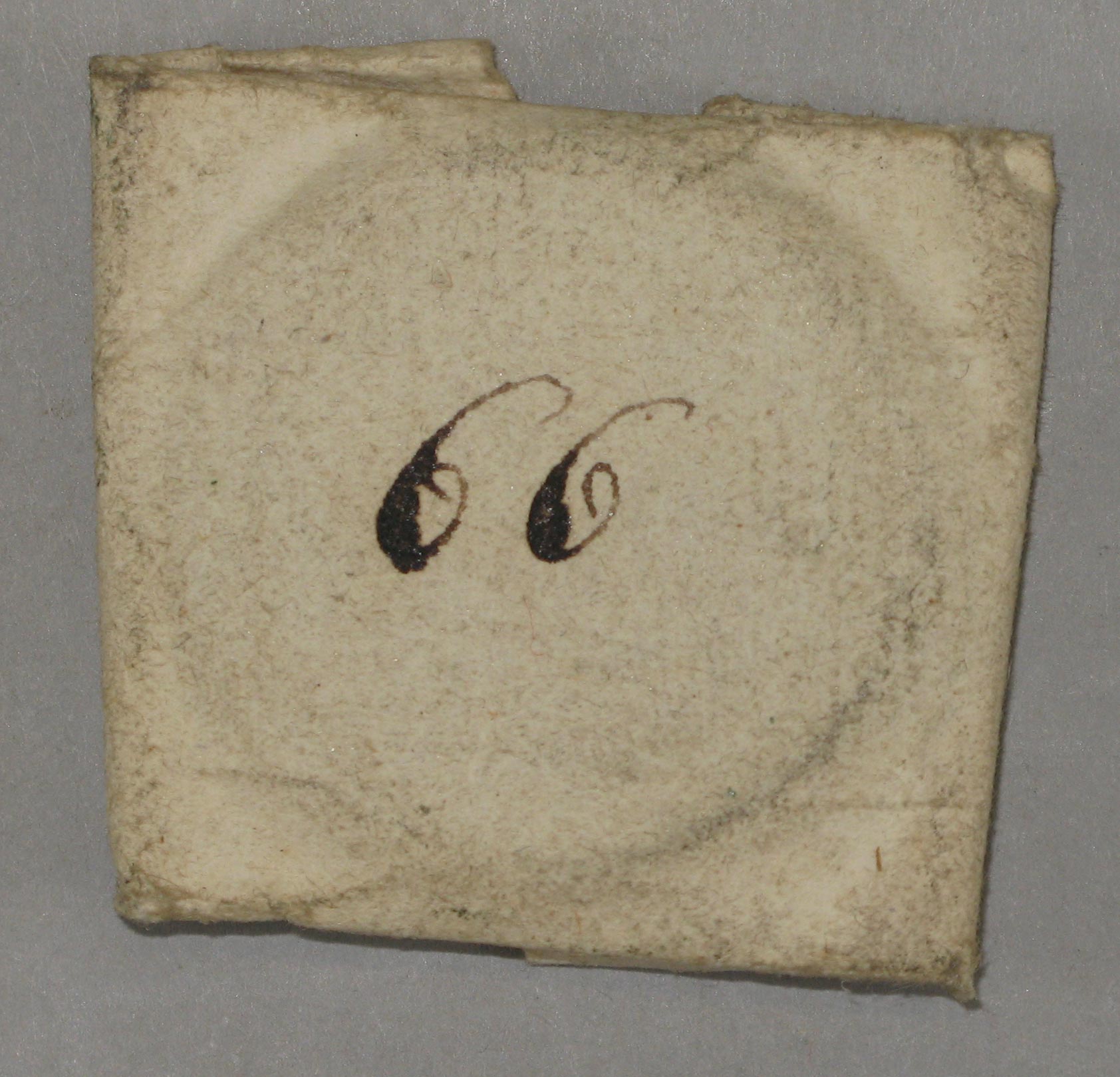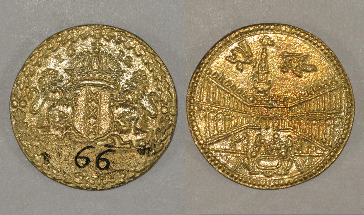 Twee makelaarsgildepenningen in papieren wikkel, nr. 66