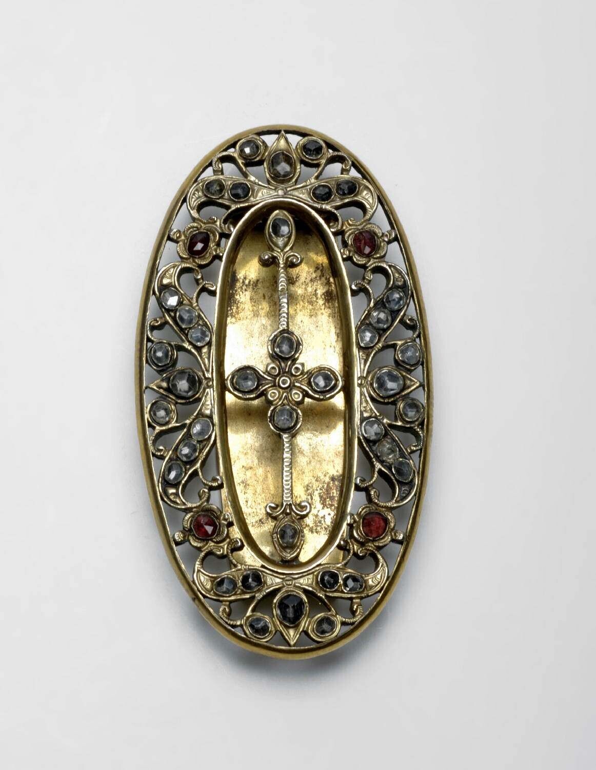 Gedeelte van een verguld zilveren gordelgesp met gla...