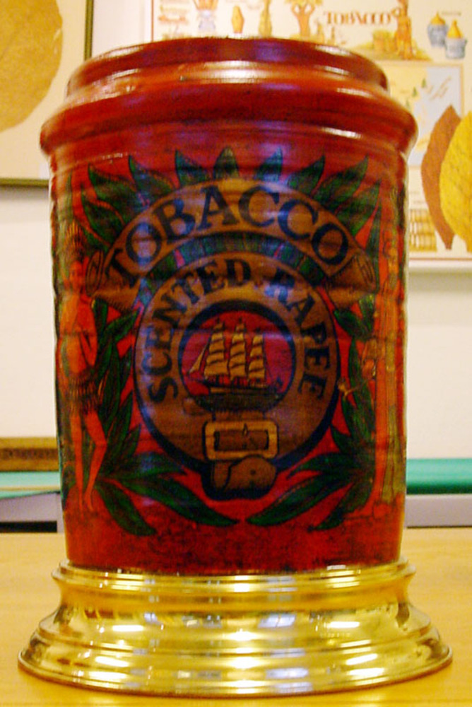 Tabakspot van keramiek en koper voorstellende blader...