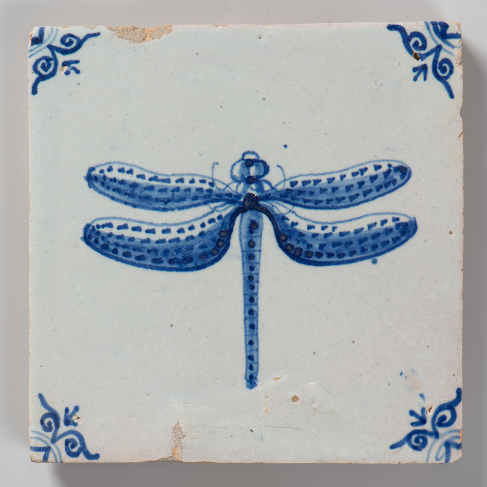 tegel van keramiek met tinglazuur, voorstellende: pl...