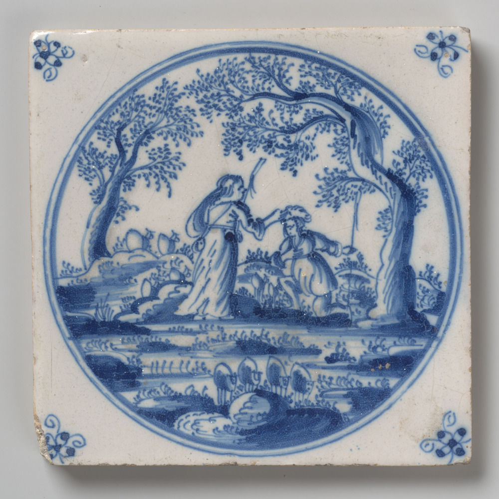Tegel van keramiek met tinglazuur, voorstellende: De...