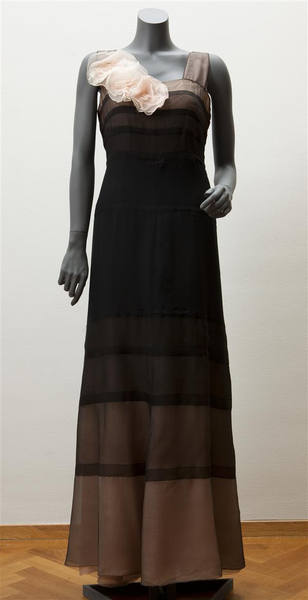 Avondjurk van zwarte zijden voile en onderlaag van r...