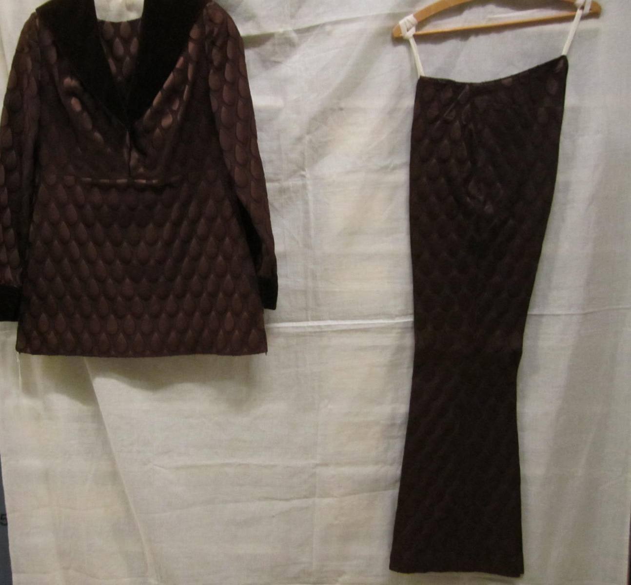 Broekpak van bruine reliefstof met ingeweven druppel...