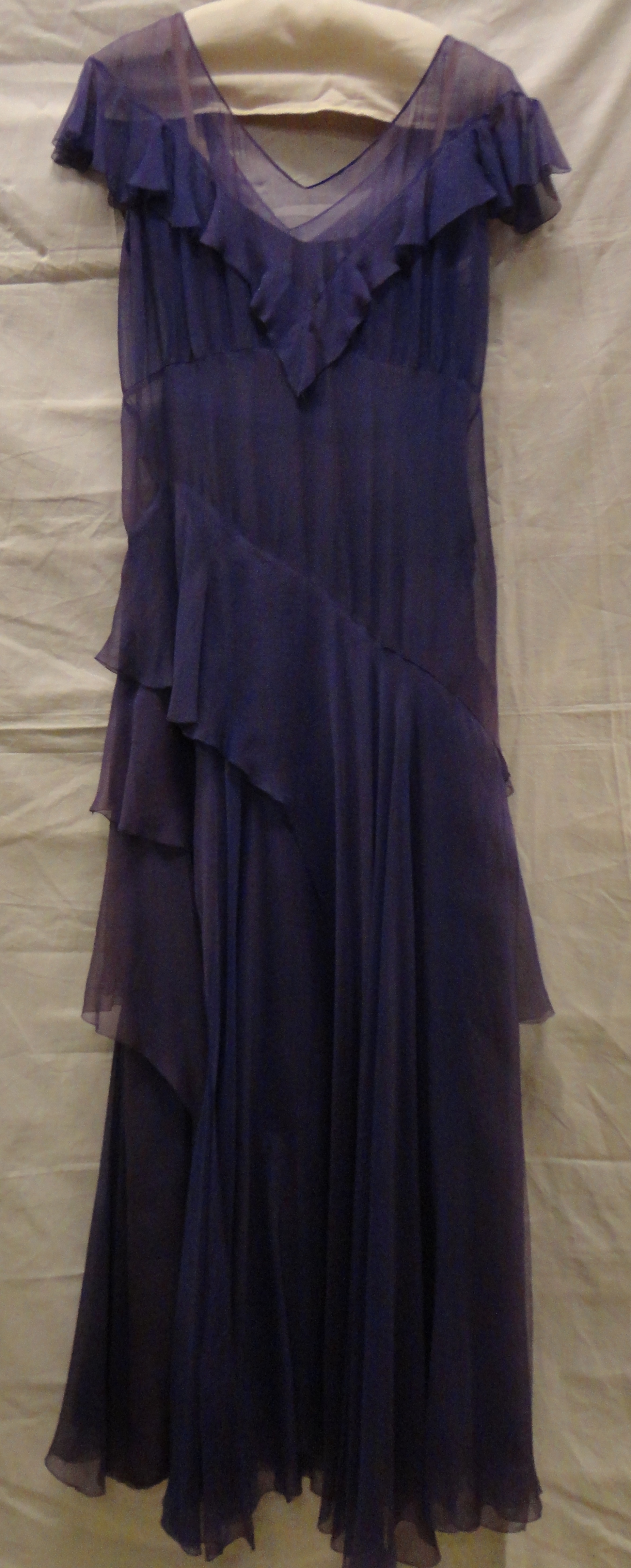 Avondjurk van paarsblauwe crêpe georgette, langs de ...