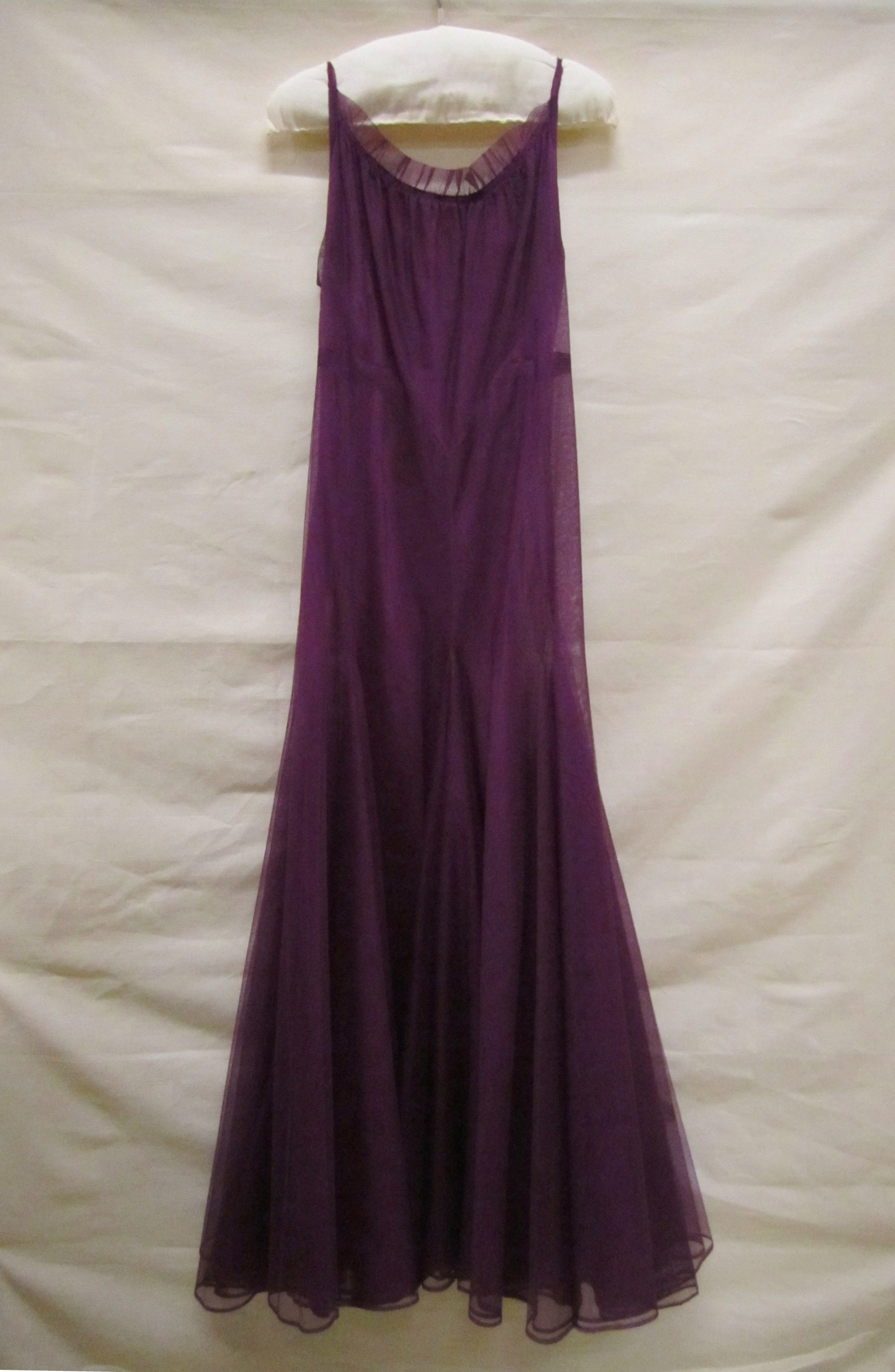 Avondjurk van paarse zijden tule met spaghetti-bandj...
